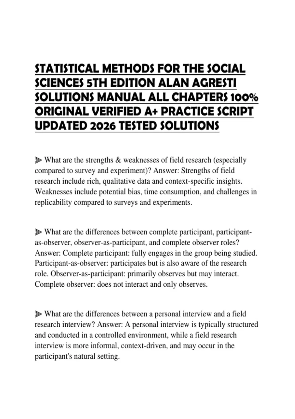 STATISTICAL METHODS FOR THE SOCIAL SCIENCES 5TH EDITION ALAN AGRESTI SOLUTIONS MANUAL ALL CHAPTERS 100% ORIGINAL VERIFIED A+ PRACTICE SCRIPT UPDATED 2026 TESTED SOLUTIONS
