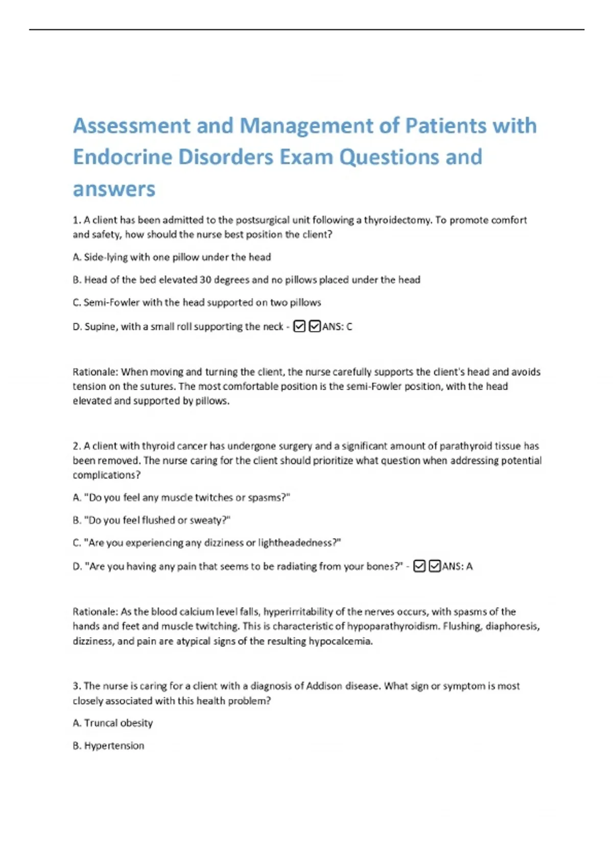 Assessment and Management of Patients with Endocrine Disorders Exam Questions and answers 1. A client has been admitted to the postsurgical unit following a thyroidectomy. To promote comfort and safety, how should the nurse best position the client? A. Side-lying with one pillow under the head B. Head of the bed elevated 30 degrees and no pillows placed under the head C. Semi-Fowler with the head supported on two pillows D. Supine, with a small roll supporting the neck - ANS: C Rationale: When moving and turning the client, the nurse carefully supports the client's head and avoids tension on the sutures. The most comfortable position is the semi-Fowler position, with the head elevated and supported by pillows.