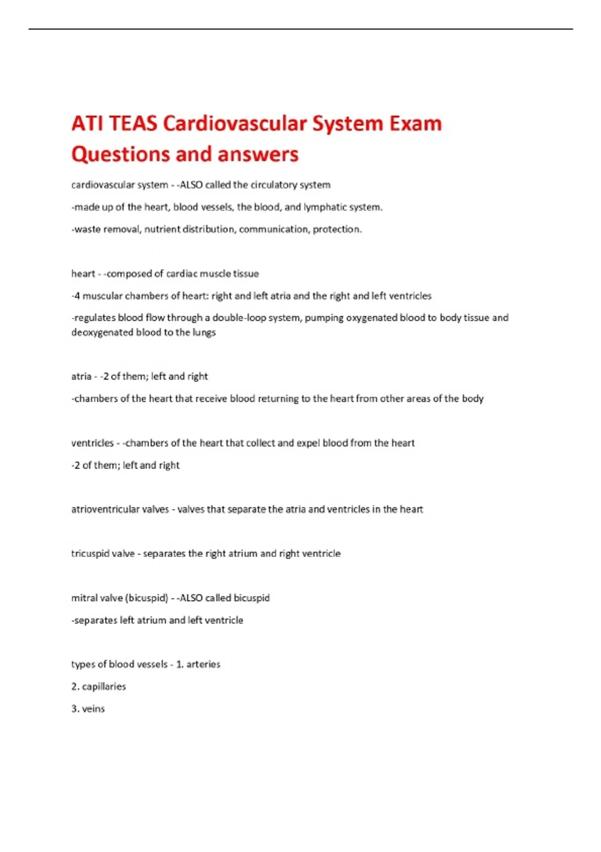 ATI TEAS Cardiovascular System Exam Questions and answers cardiovascular system - -ALSO called the circulatory system -made up of the heart, blood vessels, the blood, and lymphatic system. -waste removal, nutrient distribution, communication, protection. heart - -composed of cardiac muscle tissue -4 muscular chambers of heart: right and left atria and the right and left ventricles -regulates blood flow through a double-loop system, pumping oxygenated blood to body tissue and deoxygenated blood to the lungs