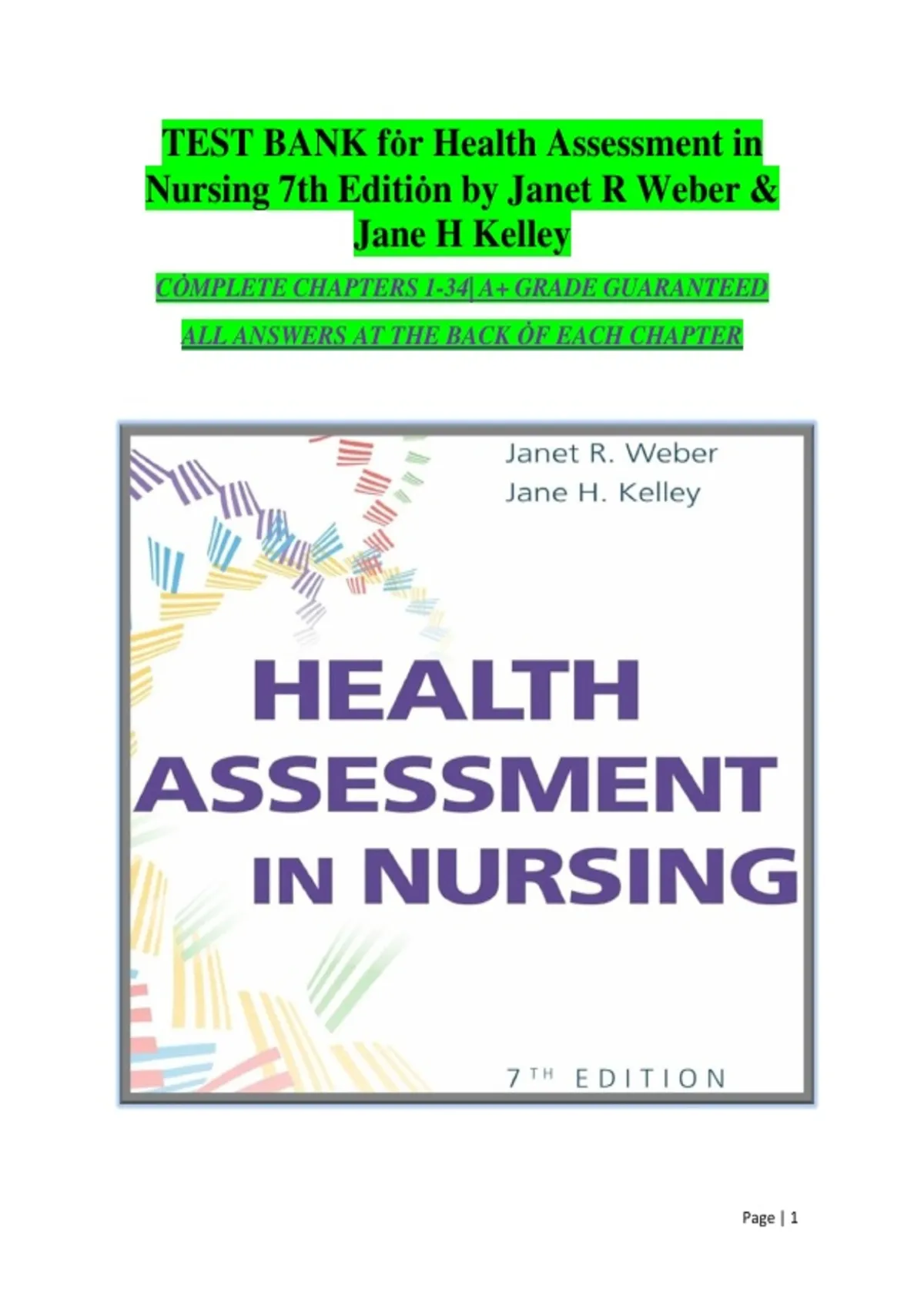 This Health Assessment in Nursing Test Bank (7th Edition) is tailored for students enrolled in the Health Assessment in Nursing course and aligned with Janet R. Weber & Jane H. Kelley’s 7th edition textbook (ISBN 9781975161156). Updated for 2026, this test bank provides comprehensive chapter‑by‑chapter practice questions covering essential nursing assessment topics including subjective and objective data collection, analysis and documentation, physical system assessments (head, thorax, abdomen, neurologic assessment), special population assessment, and holistic nursing assessment processes.