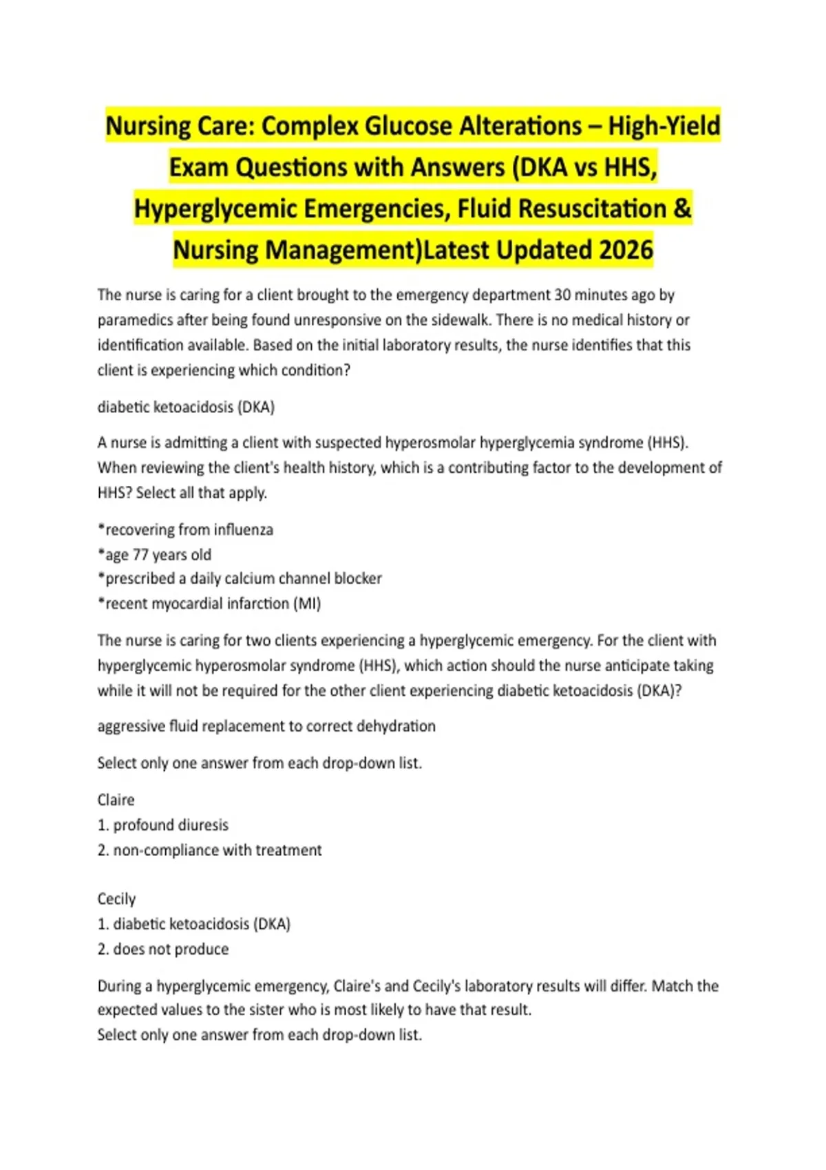 Nursing Care: Complex Glucose Alterations – High-Yield Exam Questions with Answers (DKA vs HHS, Hyperglycemic Emergencies, Fluid Resuscitation & Nursing Management)Latest Updated 2026 The nurse is caring for a client brought to the emergency department 30 minutes ago by paramedics after being found unresponsive on the sidewalk. There is no medical history or identification available. Based on the initial laboratory results, the nurse identifies that this client is experiencing which condition? diabetic ketoacidosis (DKA) A nurse is admitting a client with suspected hyperosmolar hyperglycemia syndrome (HHS). When reviewing the client's health history, which is a contributing factor to the development of HHS? Select all that apply. *recovering from influenza *age 77 years old *prescribed a daily calcium channel blocker *recent myocardial infarction (MI) The nurse is caring for two clients experiencing a hyperglycemic emergency. For the client with hyperglycemic hyperosmolar syndrome (HHS), which action should the nurse anticipate taking while it will not be required for the other client experiencing diabetic ketoacidosis (DKA)? aggressive fluid replacement to correct dehydration Select only one answer from each drop-down list. Claire 1. profound diuresis 2. non-compliance with treatment Cecily 1. diabetic ketoacidosis (DKA) 2. does not produce During a hyperglycemic emergency, Claire's and Cecily's laboratory results will differ. Match the expected values to the sister who is most likely to have that result. Select only one answer from each drop-down list. Claire 1. greater than 600 mg/dL 2. greater than 30 mg/dL 3. greater than 1.5 mg/dL 4. absent 5. absence of acidosis Cecily 1. 300-800 mg/dL 2. greater than 30 mg/dL 3. greater than 1.5 mg/dL 4. present 5. metabolic acidosis Which prescribed order should be facilitated within 30 minutes, 1 hour, or inquired with the provider? Each health care provider order is associated with only one answer. Within 30 minutes *intravenous (IV) 0.9% saline at 200 ml/hour *capillary blood glucose every 15 minutes for 2 hours *comprehensive metabolic panel (CMP) Within 1 hour *hourly serum blood glucose for 4 hours *strict intake and output *1800 calorie American Diabetes Association (ADA) diet as tolerated Question the order *regular insulin infusion at 10 units per hour *oxygen 2 L per nasal cannula Claire is resting comfortably in the intensive care unit (ICU) and asks the nurse when she may be transferred to a medical-surgical unit where her school-aged children can visit. After reviewing the most recent laboratory test results, what is the nurse's best reply? "Your potassium and glucose levels have both decreased this past hour, but the values are not where they need to be for you to leave the ICU." Claire is being discharged home after recovering from hyperglycemic hyperosmolar syndrome (HHS). Which statement by the patient requires patient re-education about this condition? "This condition happens suddenly without any warning signs." The triage nurse at a health care provider's office is speaking with Claire, who is not feeling well. What information from the Patient Information section of the EHR (the words or phrases highlighted below) should the nurse recognize as contributing to her current health condition? Select that all apply. *African American and Asian American descent *gestational diabetes *diagnosed with diabetes mellitus type 2 (DM2). *increased fluid intake *increased urinary output *eating "poorly" For each client finding below, click to specify if the finding is consistent with the disease process of diabetic ketoacidosis (DKA), hyperglycemic hyperosmolar syndrome (HHS), and/or diabetes insipidus (DI). Note: Each finding may support more than one disease process. Each column will have