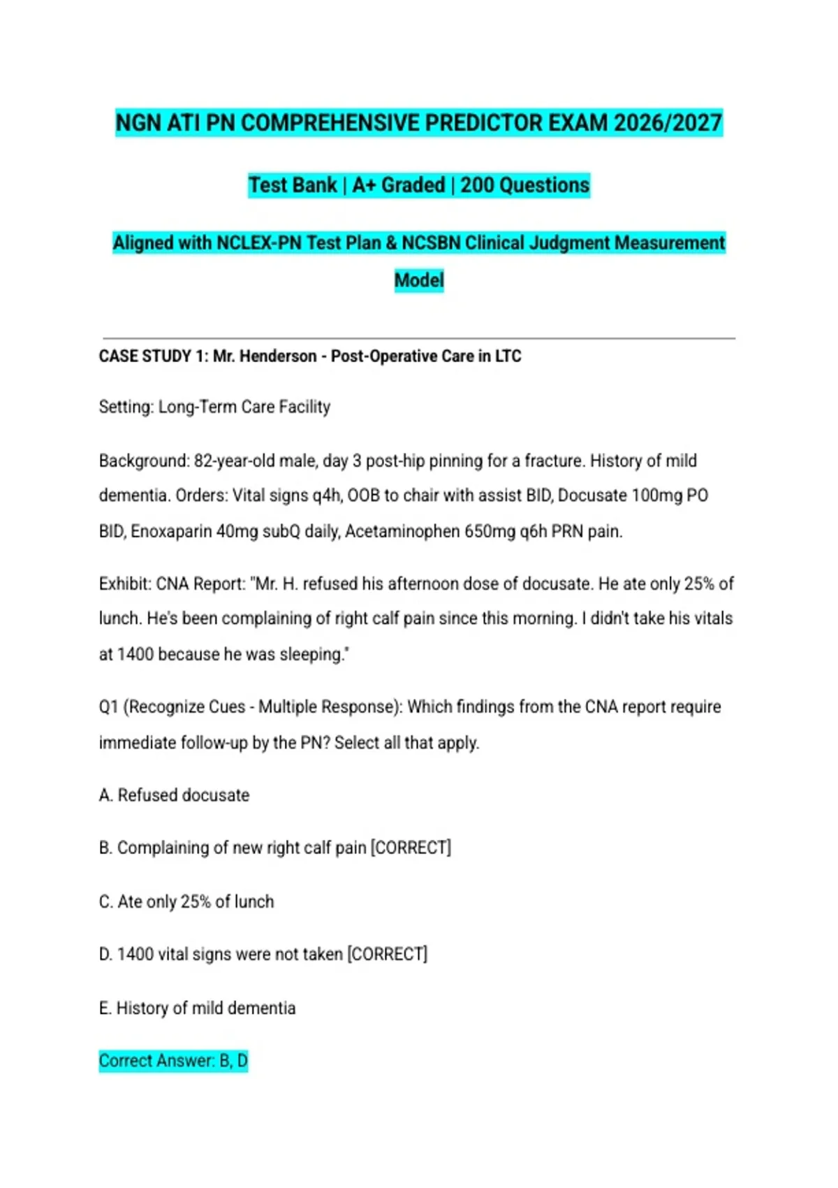 Achieve an A+ with the 2026/2027 NGN ATI PN Comprehensive Predictor Exam test bank. Features 200 questions, correct answers & rationales, and is aligned with the NCLEX-PN Test Plan and NCSBN Clinical Judgment Model.