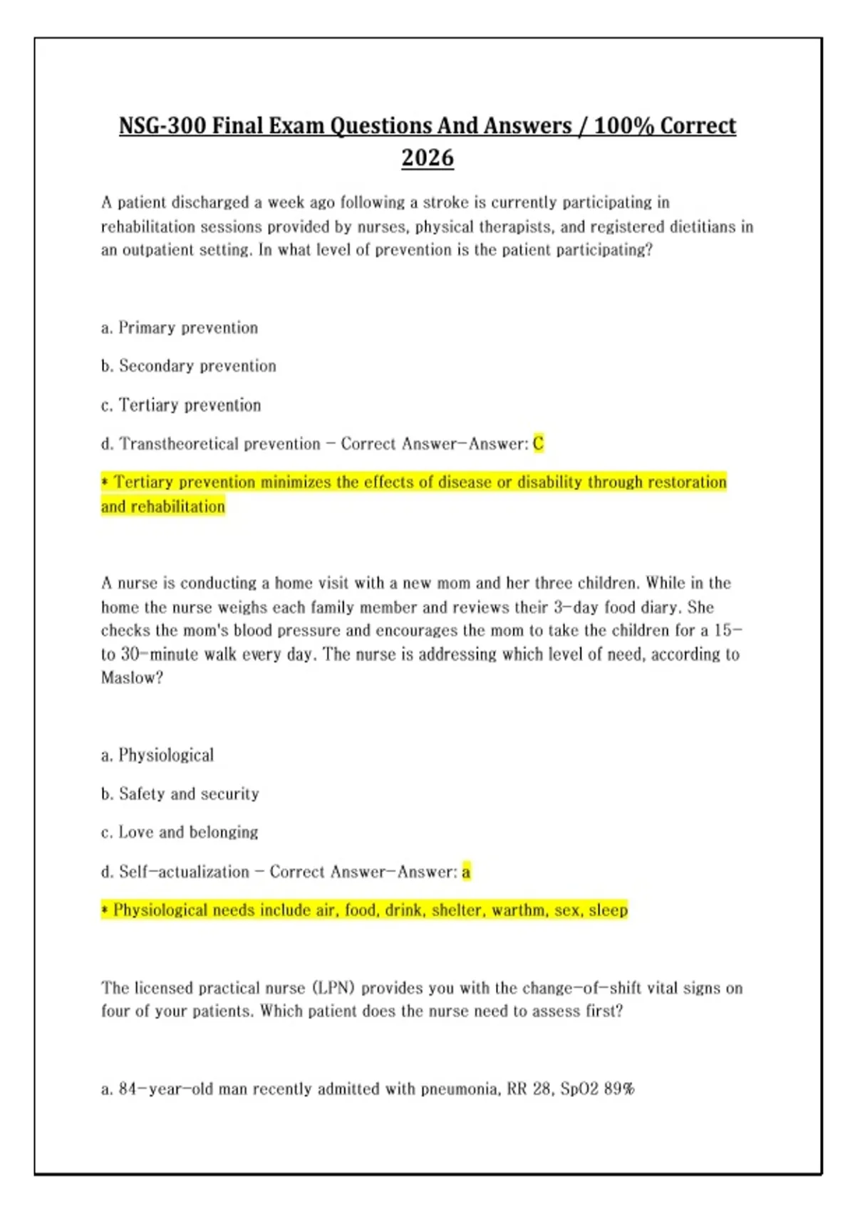 NSG-300 Final Exam Questions And Answers / 100% Correct 2026 A patient discharged a week ago following a stroke is currently participating in rehabilitation sessions provided by nurses, physical therapists, and registered dietitians in an outpatient setting. In what level of prevention is the patient participating? a. Primary prevention b. Secondary prevention c. Tertiary prevention d. Transtheoretical prevention - Correct Answer-Answer: C * Tertiary prevention minimizes the effects of disease or disability through restoration and rehabilitation A nurse is conducting a home visit with a new mom and her three children. While in the home the nurse weighs each family member and reviews their 3-day food diary. She checks the mom's blood pressure and encourages the mom to take the children for a 15- to 30-minute walk every day. The nurse is addressing which level of need, according to Maslow? a. Physiological b. Safety and security c. Love and belonging d. Self-actualization - Correct Answer-Answer Continues...