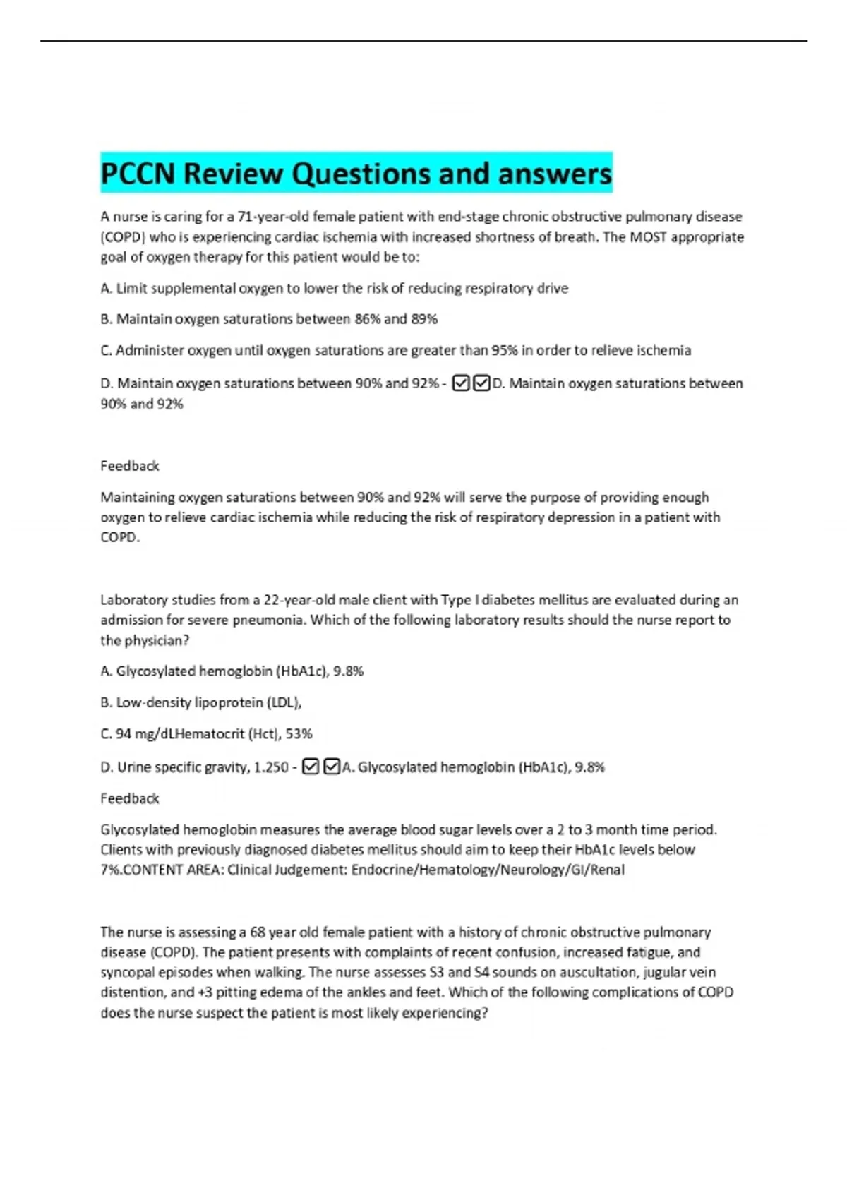 PCCN Review Questions and answers A nurse is caring for a 71-year-old female patient with end-stage chronic obstructive pulmonary disease (COPD) who is experiencing cardiac ischemia with increased shortness of breath. The MOST appropriate goal of oxygen therapy for this patient would be to: A. Limit supplemental oxygen to lower the risk of reducing respiratory drive B. Maintain oxygen saturations between 86% and 89% C. Administer oxygen until oxygen saturations are greater than 95% in order to relieve ischemia D. Maintain oxygen saturations between 90% and 92% - D. Maintain oxygen saturations between 90% and 92% Feedback Maintaining oxygen saturations between 90% and 92% will serve the purpose of providing enough oxygen to relieve cardiac ischemia while reducing the risk of respiratory depression in a patient with COPD. Laboratory studies from a 22-year-old male client with Type I diabetes mellitus are evaluated during an admission for severe pneumonia. Which of the following laboratory results should the nurse report to the physician?