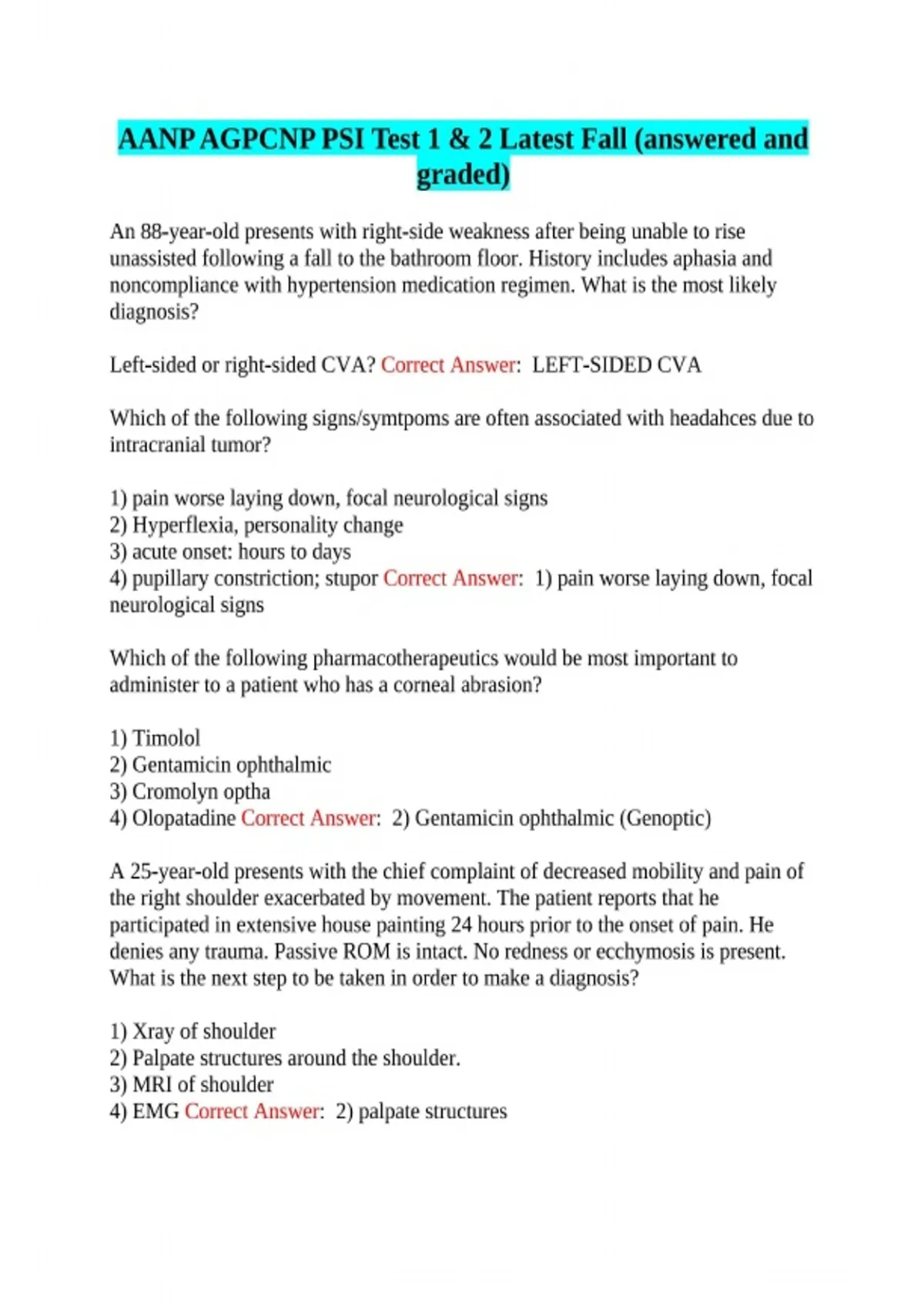 This document includes the latest AANP AGPCNP PSI Test 1 and Test 2 questions with fully answered and graded content for the Fall term. It is designed to support Adult-Gerontology Primary Care Nurse Practitioner students with exam-focused practice, review, and self-assessment aligned with PSI-style testing.