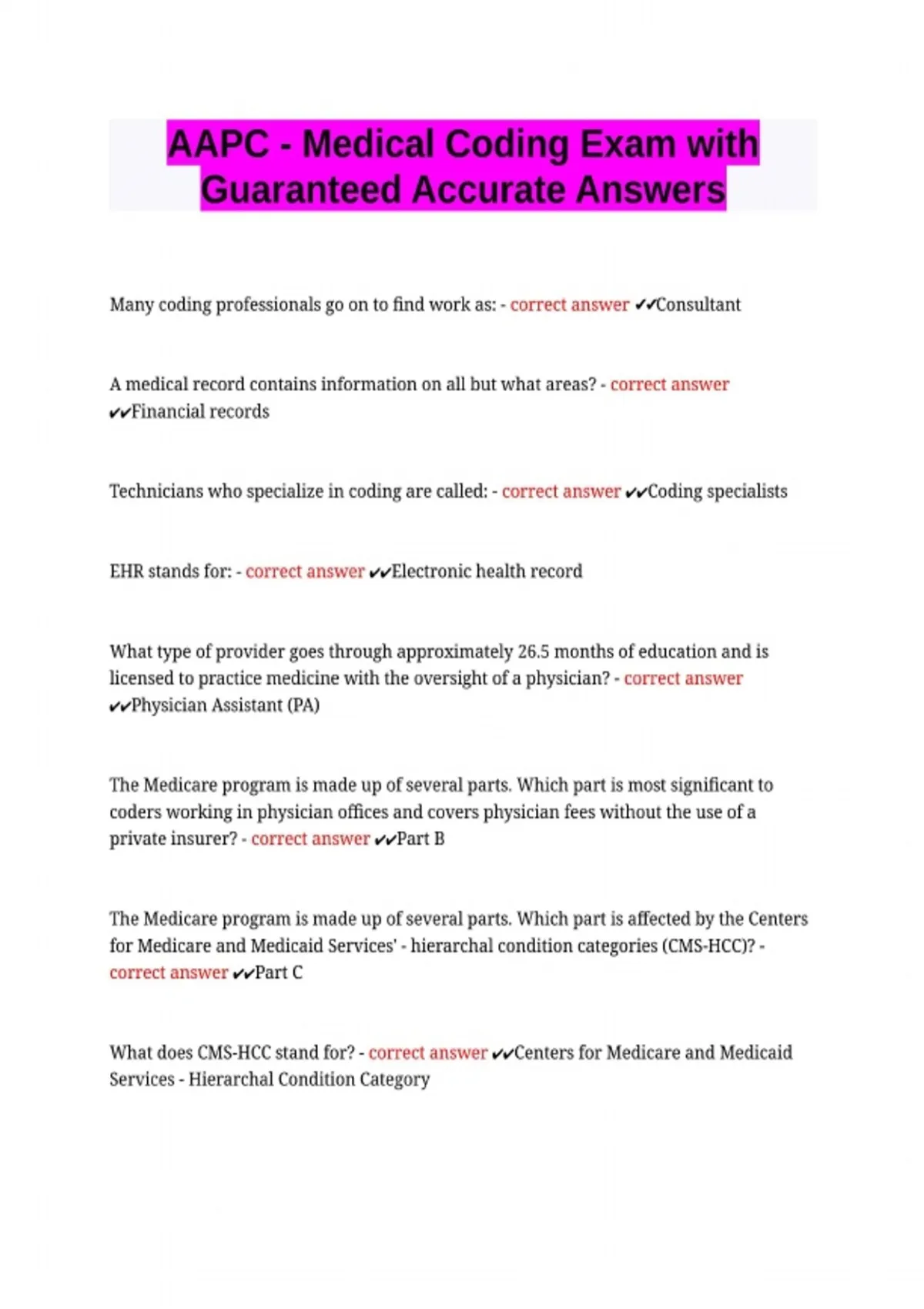 This document contains a full AAPC Medical Coding exam with guaranteed accurate answers, designed to help medical coding students and professionals prepare effectively for certification exams. It covers key coding principles, CPT, ICD-10, and HCPCS standards, making it ideal for practice, review, and ensuring exam readiness.