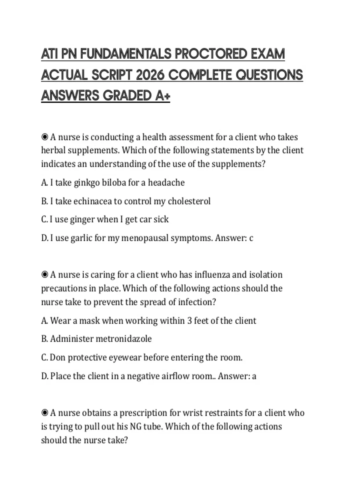 ATI PN FUNDAMENTALS PROCTORED EXAM ACTUAL SCRIPT 2026 COMPLETE QUESTIONS ANSWERS GRADED A+