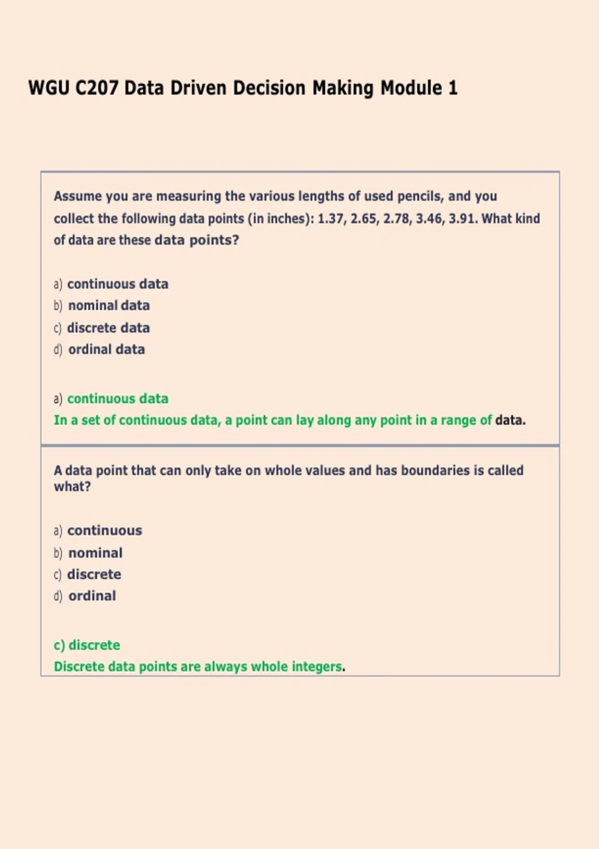 Assume you are measuring the various lengths of used pencils, and you collect the following data points (in inches): 1.37, 2.65, 2.78, 3.46, 3.91. What kind of data are these data points? a) continuous data b) nominal data c) discrete data d) ordinal data a) continuous data In a set of continuous data, a point can lay along any point in a range of data. A data point that can only take on whole values and has boundaries is called what? a) continuous b) nominal c) discrete d) ordinal c) discrete Discrete data points are always whole integers. If a measure is consistent and repeatable it is said to be _. a) good b) correct c) valid d) reliable d) reliable To be considered reliable, a measure must be repeatable in multiple locations under diverse conditions. A small group from which you make an inference about an entire population is called a __________. a) sample b) representation c) model d) medium a) sample If chosen properly, a sample can make predictions about an entire population. Cleaning and organizing data that has been collected is known as _. a) data cleanup b) data entry c) data management d) data mining c) data management Managing your data is as important as your analysis. The first step in the Davenport-Kim three-stage model is to frame the problem by recognizing what the problem is and then reviewing previous findings to begin to structure the analysis. T/F T. Stage #1 is to frame the problem by recognizing what the problem is and then reviewing previous findings to begin to structure the analysis. Stage #2 is to solve the problem. Stage #3 is the communicate your findings. The stage that involves the most intense statistics and data work is stage 3, communicating results. T/F F. The stage that involves the most intense statistics and data work is stage 2, solving the problem. This step includes data modeling, data collection, and data analysis. The following are examples of nominal data: T/F male/female red/blue living/deceased T. Nominal data, sometimes called categorical data, places objects into a category. Interval data has an order and all the objects are an equal interval apart. T/F T. Interval data has an order and all the objects are an equal interval apart. You cannot have a natural zero point in interval data. Observational studies are often used when a surveyor wants to adjust different variables and take note of the effects. T/F F. Observational studies are used when it is impractical or impossible to control the conditions of the experiment. Data is valid if it can be repeated by the same person in the same lab each and every time the experiment is executed. T/F F. Data is only valid if the experiments can be executed by more than one individual in different locations (not necessarily different conditions as that could be part of the experiment). Big Data A catch-phrase that describes a massive volume of data that is so large that it's difficult to process using traditional database and software techniques Blind Study A study performed where the participants are not told if they are in the treatment group or control group. Continuous Data Data that can lay along any point in a range of data Data Management The management, including cleaning and storage, of collected data Decision Tree Analysis The diagraming of possible alternatives and their expected consequences in order to formulate possible courses of actions in order to make decisions 3/14/26, 1:42 PM WGU C207 Data Driven Decision Making Module 1 / 1/16 Discrete Data Data that can only take on whole values and has clear boundaries Quantitative analysis is another name for what? a) algebra b) mathematics c) statistics d) probability c) statistics If a dataset is presented on a scale of hours per week, which scale of measurement is being used? a) nominal b) ordinal c) interval d) ratio d) ratio