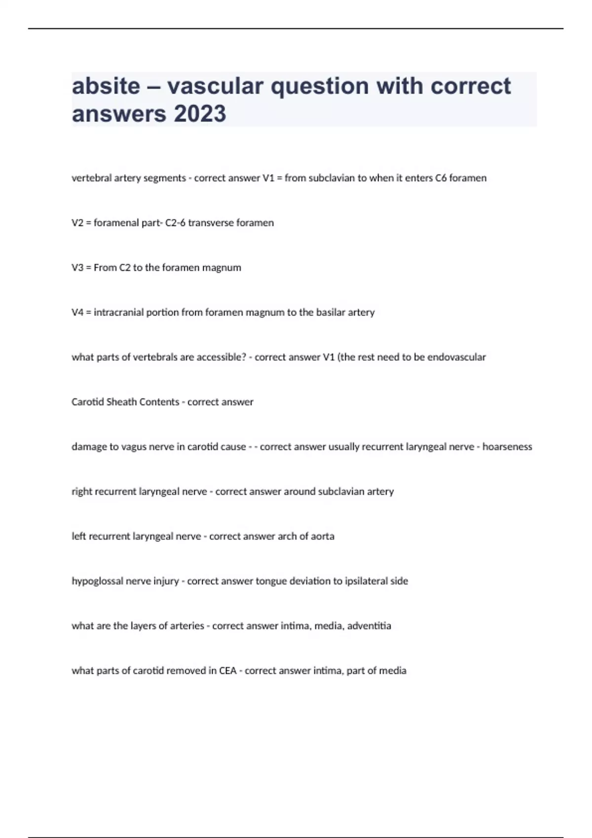 absite – vascular question with correct answers 2023vertebral artery segments - correct answer V1 = from subclavian to when it enters C6 foramen V2 = foramenal part- C2-6 transverse foramen V3 = From C2 to the foramen magnum V4 = intracranial portion from foramen magnum to the basilar artery what parts of vertebrals are accessible? - correct answer V1 (the rest need to be endovascular Carotid Sheath Contents - correct answer damage to vagus nerve in carotid cause - - correct answer usually recurrent laryngeal nerve - hoarseness right recurrent laryngeal nerve - correct answer around subclavian artery left recurrent laryngeal nerve - correct answer arch of aorta hypoglossal nerve injury - correct answer tongue deviation to ipsilateral side what are the layers of arteries - correct answer intima, media, adventitia what parts of carotid removed in CEA - correct answer intima, part of media asymptomatic dz - when to offer CEA? - correct answer 80% symptomatic dz - when to offer CEA? - correct answer 50% orders to clamp carotid in CEA - correct answer internal common external