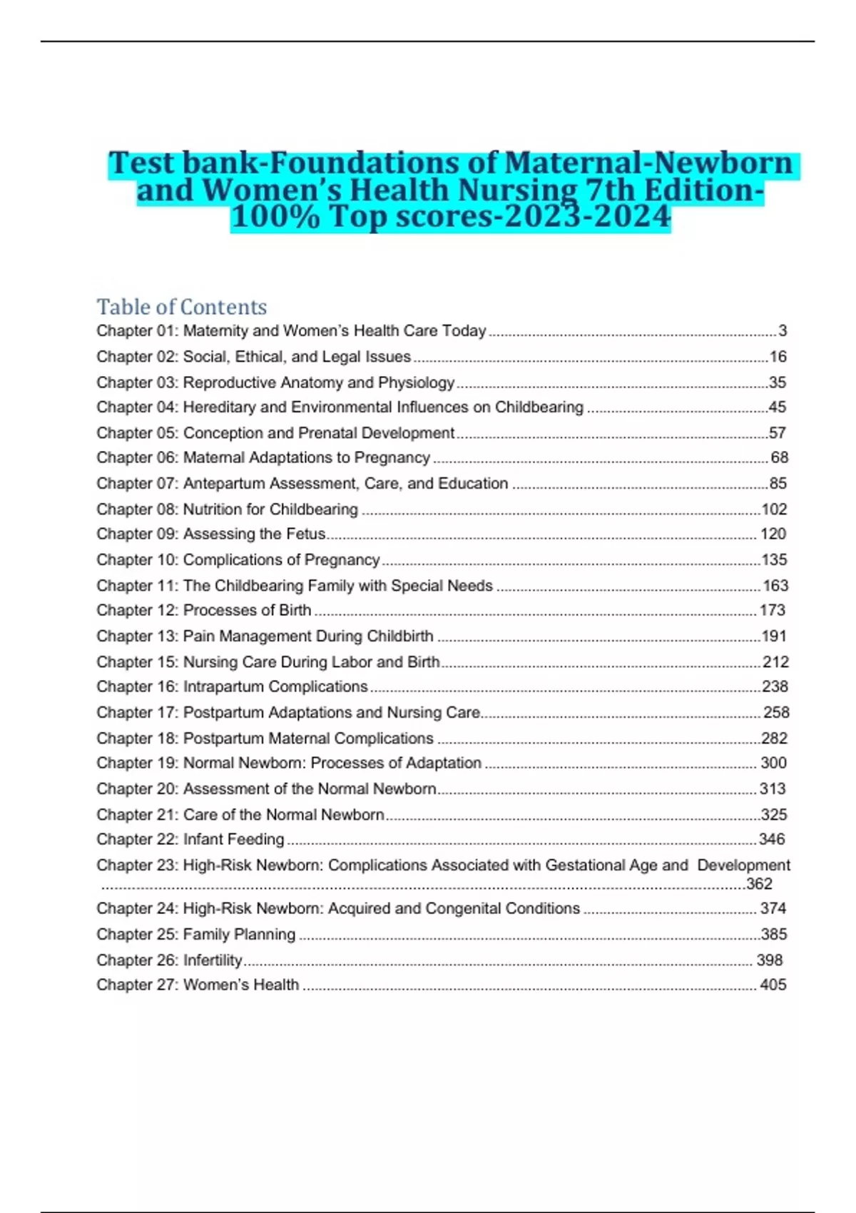 Test bank-Foundations of Maternal-Newborn and Women’s Health Nursing 7th Edition-100% Top scores-