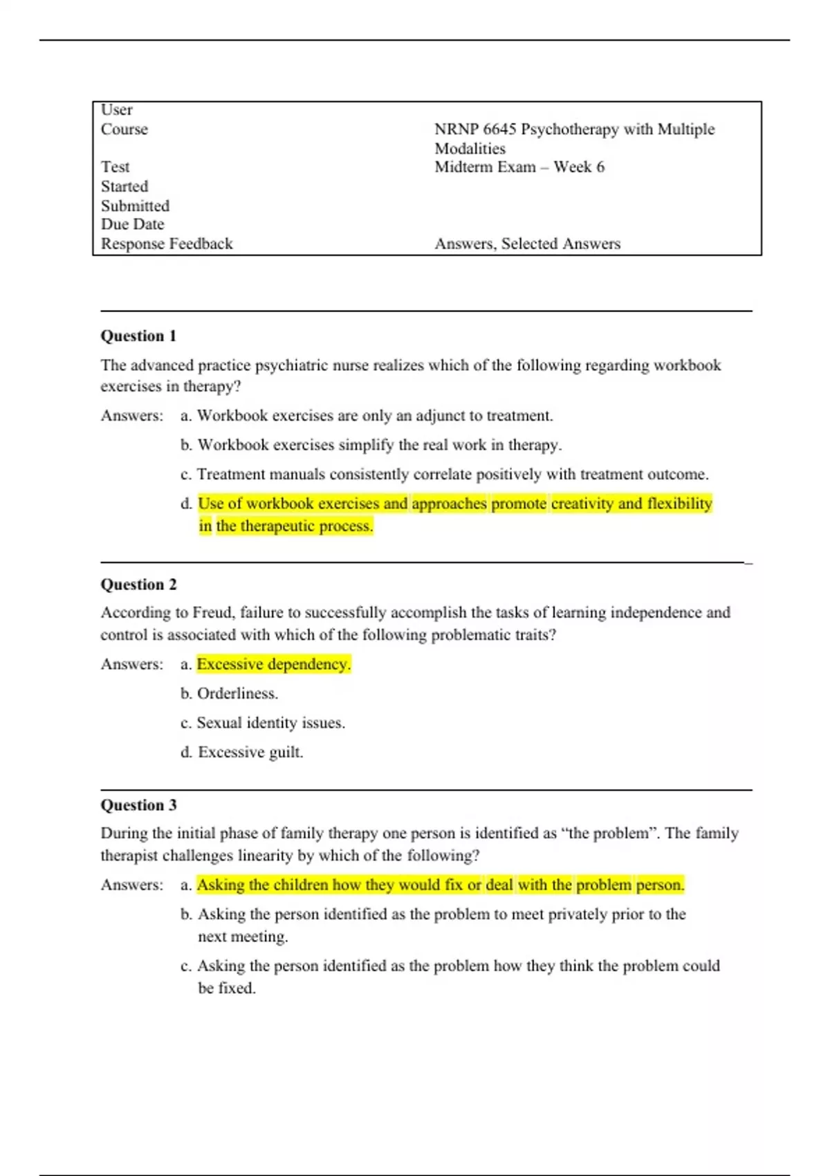 NRNP 6645 (Psychotherapy with Multiple Modalities) Module 2 Week 6 Midterm Exam