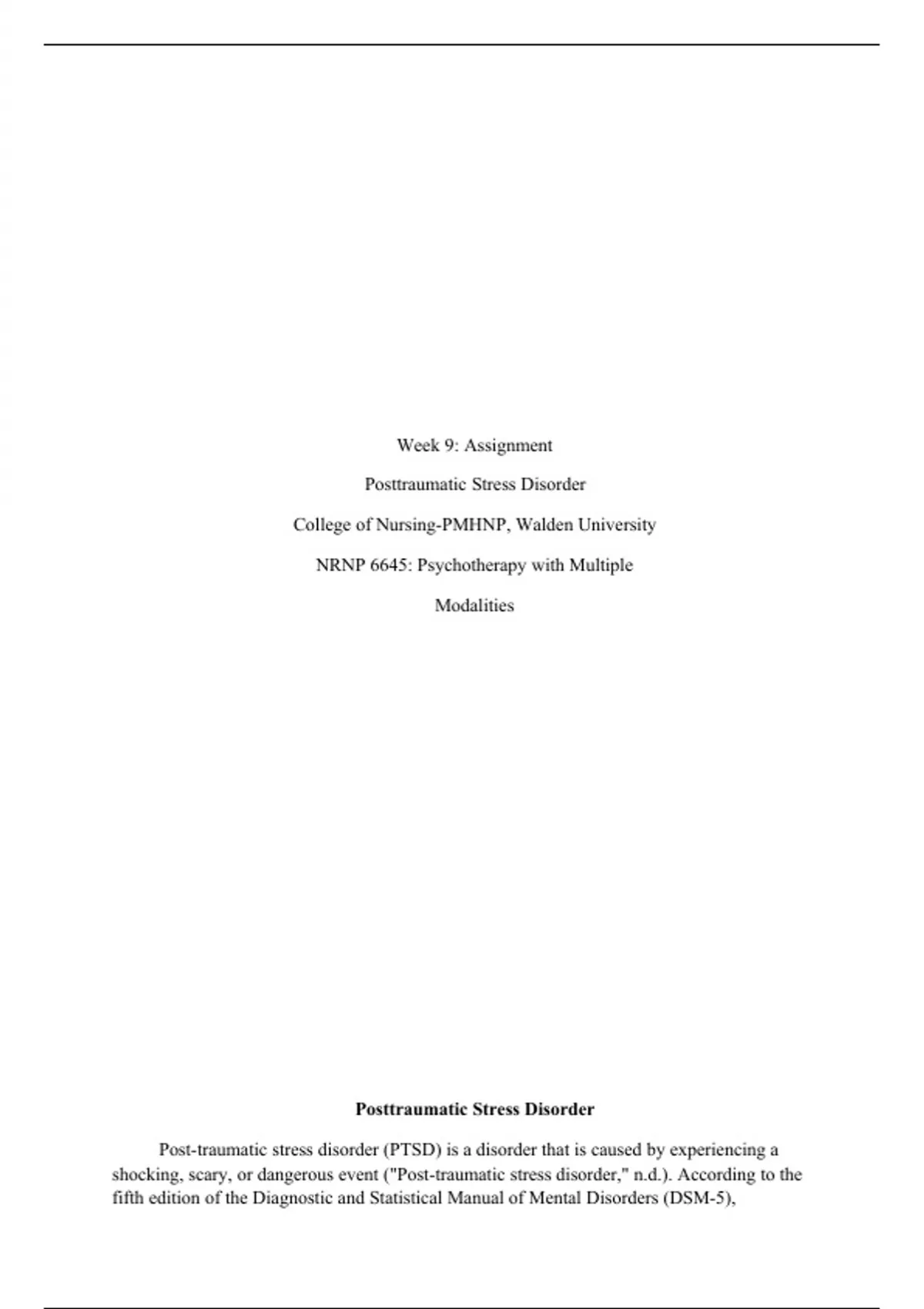 NRNP 6645 (Psychotherapy with Multiple Modalities) Module 3 Week 9 Assignment, Posttraumatic Stress Disorder