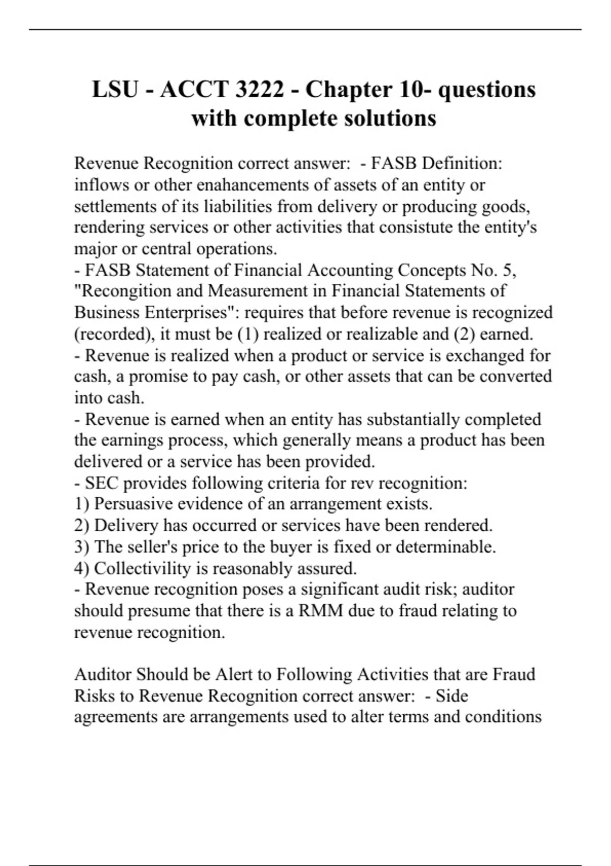 Revenue Recognition correct answer: - FASB Definition: inflows or other enahancements of assets of an entity or settlements of its liabilities from delivery or producing goods, rendering services or other activities that consistute the entity's major or central operations. - FASB Statement of Financial Accounting Concepts No. 5, "Recongition and Measurement in Financial Statements of Business Enterprises": requires that before revenue is recognized (recorded), it must be (1) realized or realizable and (2) earned. - Revenue is realized when a product or service is exchanged for cash, a promise to pay cash, or other assets that can be converted into cash. - Revenue is earned when an entity has substantially completed the earnings process, which generally means a product has been delivered or a service has been provided. - SEC provides following criteria for rev recognition: 1) Persuasive evidence of an arrangement exists. 2) Delivery has occurred or services have been rendered. 3) The seller's price to the buyer is fixed or determinable. 4) Collectivility is reasonably assured. - Revenue recognition poses a significant audit risk; auditor should presume that there is a RMM due to fraud relating to revenue recognition. Auditor Should be Alert to Following Activities that are Fraud Risks to Revenue Recognition correct answer: - Side agreements are arrangements