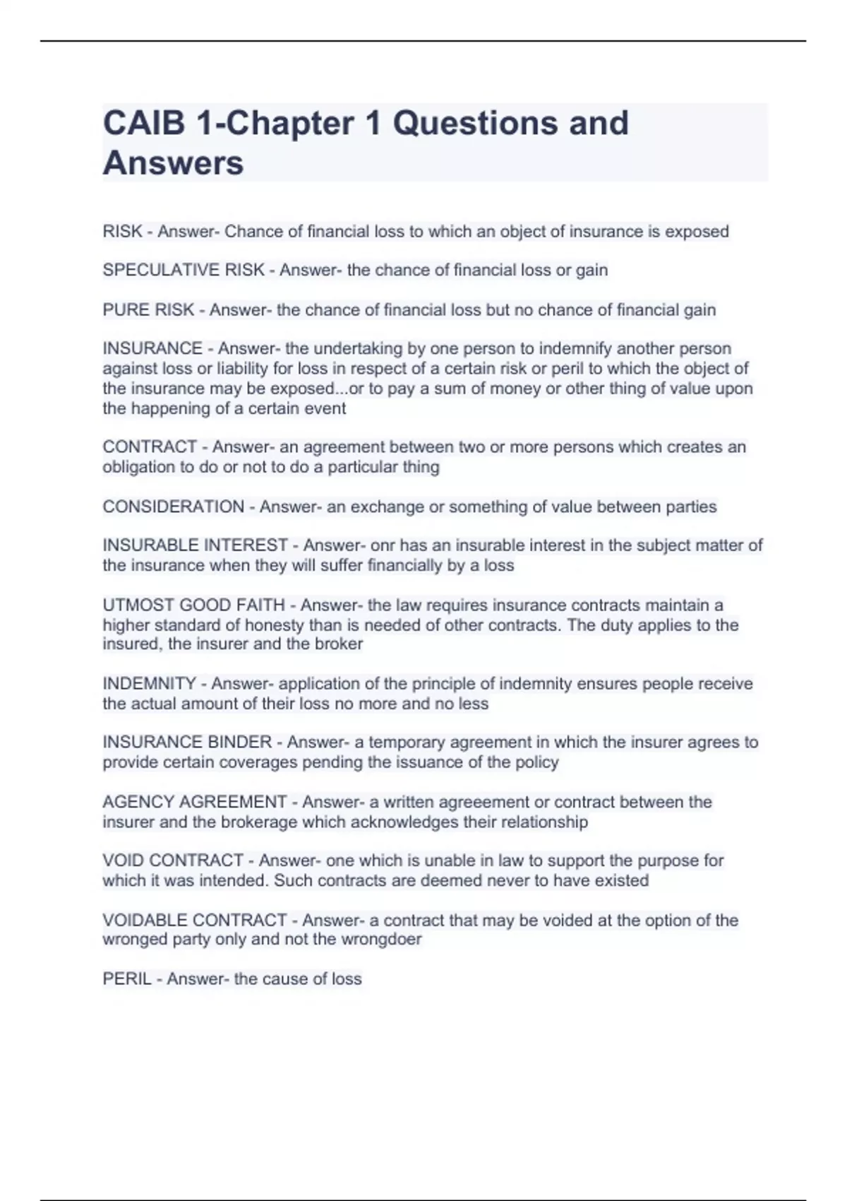 RISK - Answer- Chance of financial loss to which an object of insurance is exposed SPECULATIVE RISK - Answer- the chance of financial loss or gain PURE RISK - Answer- the chance of financial loss but no chance of financial gain INSURANCE - Answer- the undertaking by one person to indemnify another person against loss or liability for loss in respect of a certain risk or peril to which the object of the insurance may be exposed...or to pay a sum of money or other thing of value upon the happening of a certain event CONTRACT - Answer- an agreement between two or more persons which creates an obligation to do or not to do a particular thing CONSIDERATION - Answer- an exchange or something of value between parties INSURABLE INTEREST - Answer- onr has an insurable interest in the subject matter of the insurance when they will suffer financially by a loss UTMOST GOOD FAITH - Answer- the law requires insurance contracts maintain a higher standard of honesty than is needed of other contracts. The duty applies to the insured, the insurer and the broker INDEMNITY - Answer- application of the principle of indemnity ensures people receive the actual amount of their loss no more and no less INSURANCE BINDER - Answer- a temporary agreement in which the insurer agrees to provide certain coverages pending the issuance of the policy AGENCY AGREEMENT - Answer- a written agreeement or contract between the insurer and the brokerage which acknowledges their relationship VOID CONTRACT - Answer- one which is unable in law to support the purpose for which it was intended. Such contracts are deemed never to have existed VOIDABLE CONTRACT - Answer- a contract that may be voided at the option of the wronged party only and not the wrongdoer PERIL - Answer- the cause of loss