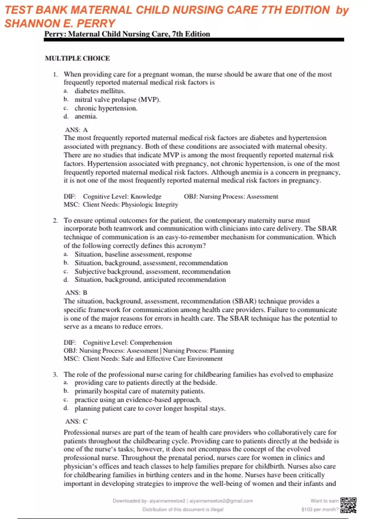 Test Bank For Maternal Child Nursing Care 7th Edition by Shannon E. Perry, Marilyn J. Hockenberry, Mary Catherine Cashion Chapter 1-50 Complete