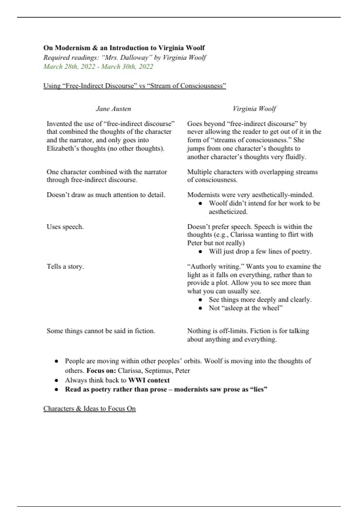 Required readings: “Mrs. Dalloway” by Virginia Woolf