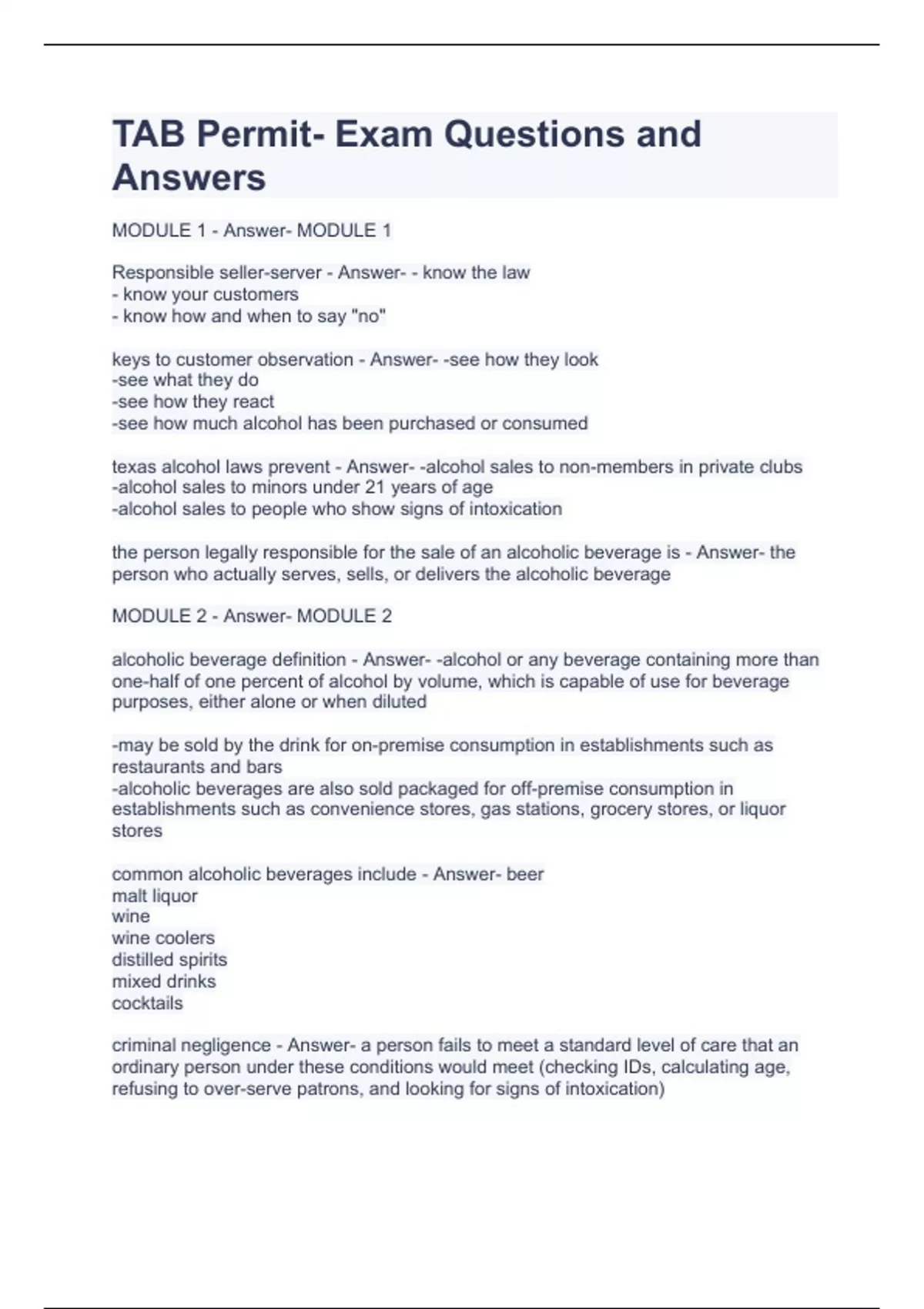 TAB Permit- Exam Questions and Answers