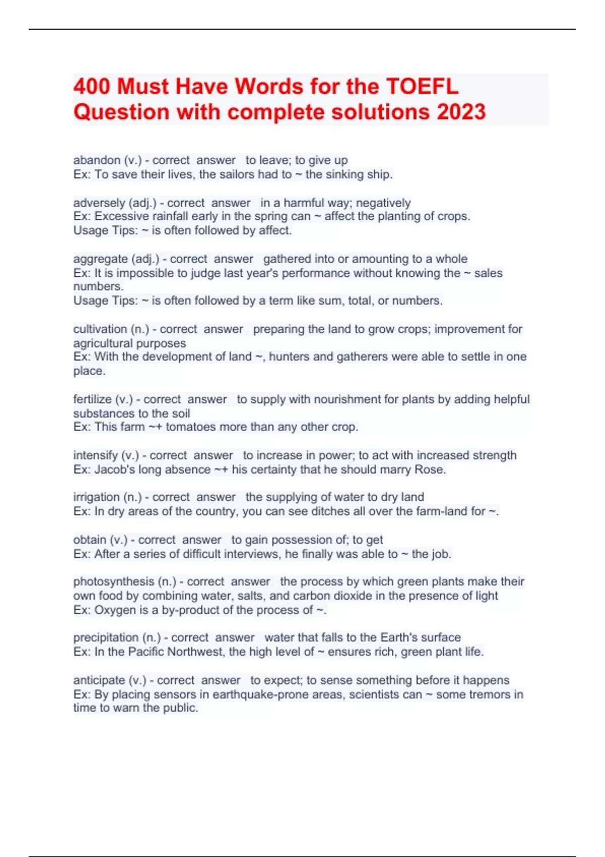 400 Must Have Words for the TOEFL Question with complete solutions 2023abandon (v.) to leave; to give up Ex: To save their lives, the sailors had to ~ the sinking ship. adversely (adj.) in a harmful way; negatively Ex: Excessive rainfall early in the spring can ~ affect the planting of crops. Usage Tips: ~ is often followed by affect. aggregate (adj.) gathered into or amounting to a whole Ex: It is impossible to judge last year's performance without knowing the ~ sales numbers. Usage Tips: ~ is often followed by a term like sum, total, or numbers. cultivation (n.) preparing the land to grow crops; improvement for agricultural purposes Ex: With the development of land ~, hunters and gatherers were able to settle in one place. fertilize (v.) to supply with nourishment for plants by adding helpful substances to the soil Ex: This farm ~+ tomatoes more than any other crop. intensify (v.) to increase in power; to act with increased strength Ex: Jacob's long absence ~+ his certainty that he should marry Rose. irrigation (n.) the supplying of water to dry land Ex: In dry areas of the country, you can see ditches all over the farm-land for ~. obtain (v.) to gain possession of; to get Ex: After a series of difficult interviews, he finally was able to ~ the job. photosynthesis (n.) the process by which green plants make their own food by combining water, salts, and carbon dioxide in the presence of light Ex: Oxygen is a by-product of the process of ~. precipitation (n.) water that falls to the Earth's surface Ex: In the Pacific Northwest, the high level of ~ ensures rich, green plant life. anticipate (v.) to expect; to sense something before it happens Ex: By placing sensors in earthquake-prone areas, scientists can ~ some tremors in time to warn the public.
