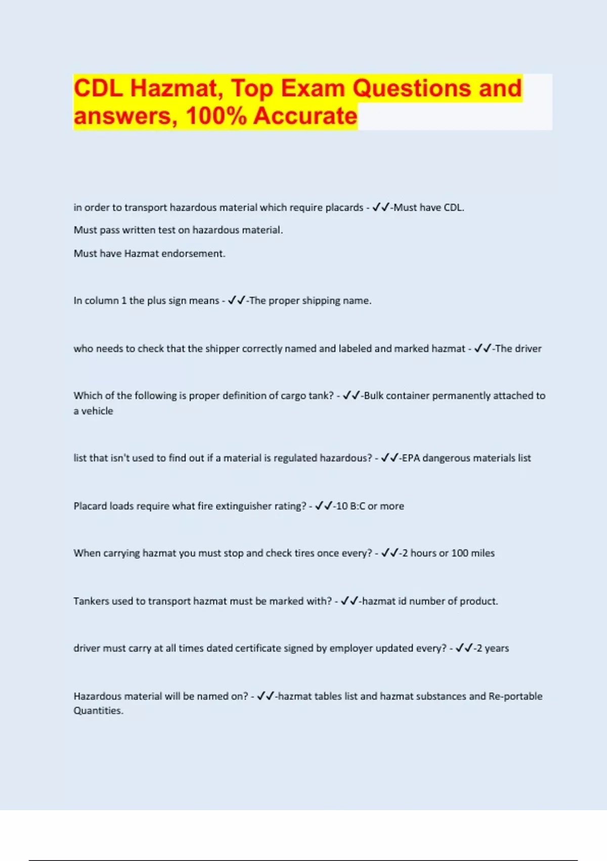 CDL Hazmat, Top Exam Questions and answers, 100% Accurate in order to transport hazardous material which require placards - -Must have CDL. Must pass written test on hazardous material. Must have Hazmat endorsement. In column 1 the plus sign means - -The proper shipping name. who needs to check that the shipper correctly named and labeled and marked hazmat - -The driver Which of the following is proper definition of cargo tank? - -Bulk container permanently attached to a vehicle list that isn't used to find out if a material is regulated hazardous? - -EPA dangerous materials list Placard loads require what fire extinguisher rating? - -10 B:C or more When carrying hazmat you must stop and check tires once every? - -2 hours or 100 miles Tankers used to transport hazmat must be marked with? - -hazmat id number of product. driver must carry at all times dated certificate signed by employer updated every? - -2 years Hazardous material will be named on? - -hazmat tables list and hazmat substances and Re-portable Quantities. What is the shape and size of a placard? - -10 3/4 inch square or diamond Can't park hazmat vehicle within how many feet of a fire? - -300 feet Hazardous Materials that don't allow you to park within 5 feet of road? - -Explosives A and B A placard vehicle must have at least how many placards? - -four If hauling hazmat and you have a leaking tire you must? - -Stop at safe place and repair When fueling a placard vehicle someone must always be? - -At the nozzle controlling the flow what type of extinguisher is required in the power unit of a placard vehicle. - -A U.I rating of 10 B/c or above Hazmat class name or id number may not be used to describe a? - -Non hazardous material After a hazmat accident you should first do? - -send someone for help and warn others A placard on the trailer is intended to? - -Communicate risk or hazmat How many identical placards is a vehicle hauling hazmat required to display and where? - -four. one on front and back and one on each side The basic shipment of a hazmat product must include? - -proper shipping name, hazmat class and id number if X or RQ is in the HM column of a shipping paper entry the? - -shipment is regulated by hazmat regulations What placard must be used with inhalation hazmat load? - -Poison Which of the statements bout Radioactive labels is true? - -Yellow III indicates the highest level of radioactivity When transporting hazmat and non hazmat your bills must? - -Describe hazmat first. Hazmat highlighted. Id materials by X or RQ in HM column. On the Hazmat table column 1 shows? - -to what shipping mode the information on the line applies If the hazmat is classified as FORBIDDEN you should? - -Refuse the load The hazmat waste manifest should be? - -Tabbed differently and kept on top of all other paperwork You should never transport a package labeled poison if you are hauling? - -Food products when a spill of an RQ happens the carrier has how long to report spill? - -30 days cylinders containing compressed gases may only be loaded onto a vehicle without a flat floor or platform if cylinders are? - -In boxes that will keep them from turning over. Loaded into racks attached to vehicle. Loaded in an upright or horizontal position. if load requires placard what must shipper put on package? - -The required label. The hazmat shipping name and id number.