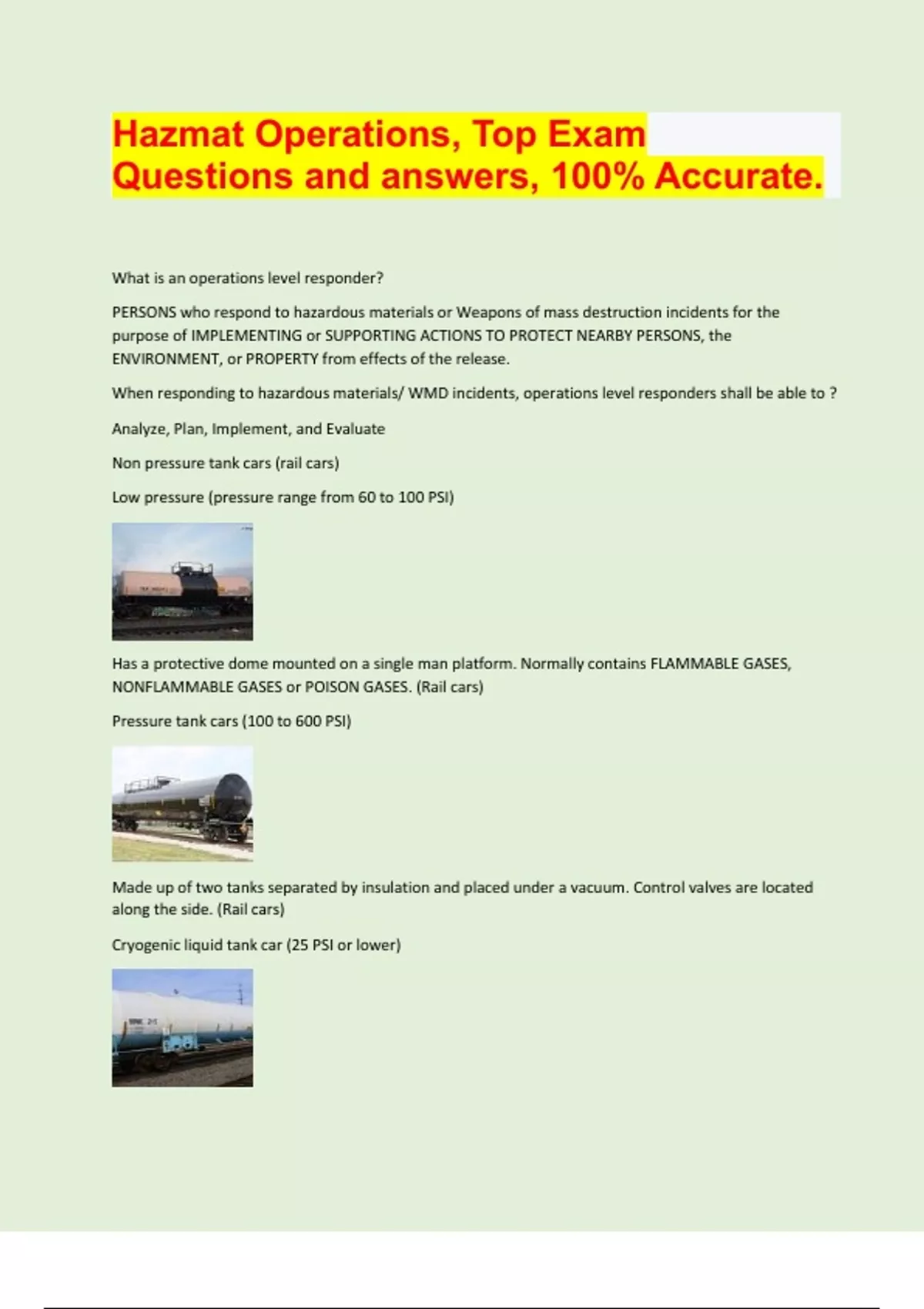 Hazmat Operations, Top Exam Questions and answers, 100% Accurate. What is an operations level responder? PERSONS who respond to hazardous materials or Weapons of mass destruction incidents for the purpose of IMPLEMENTING or SUPPORTING ACTIONS TO PROTECT NEARBY PERSONS, the ENVIRONMENT, or PROPERTY from effects of the release. When responding to hazardous materials/ WMD incidents, operations level responders shall be able to ? Analyze, Plan, Implement, and Evaluate Non pressure tank cars (rail cars) Low pressure (pressure range from 60 to 100 PSI) Has a protective dome mounted on a single man platform. Normally contains FLAMMABLE GASES, NONFLAMMABLE GASES or POISON GASES. (Rail cars) Pressure tank cars (100 to 600 PSI) Made up of two tanks separated by insulation and placed under a vacuum. Control valves are located along the side. (Rail cars) Cryogenic liquid tank car (25 PSI or lower) Bulk containers consists of? (Rail cars) A single metal tank mounted inside a sturdy metal supporting structure. Hazard classes 3,4,5,6,8 (25.4 to 100 PSI) example is whiskey. (Rail cars) IM-101 (IMO Type 1) portable tank Hazard classes 3,6,8 (14.5 to 25.4 PSI) transports whiskey and wine. (Rail cars) IM-102 (IMO Type 2) portable tank Hazard classes 2,3 (100 to 500 PSI) transports liquified petroleum gas (rail cars) Pressure intermodal tank containers Hazard class 2.2 (25 PSI or less) transports helium, nitrogen, and oxygen. (IMO Type 7) (Rail cars) Cryogenic intermodal tanks Hazard class 2.2 (3000 to 5000 PSI) characteristics (permanently mounted within a frame) (Rail cars) Tube modules Hazard classes 5.1, 9 (no greater than 80 PSI) characteristics is V shaped bins and known as "hopper trailer" (unloaded from the bottom and pneumatic- operated by air) (cargo tanks) Dry bulk cargo tanks Hazard class 3 ( greater than 3 PSI but no more than 5 PSI) characteristics large oval ends, spill rail, underbelly outlets. Non pressure liquid cargo tanks (ends with 06) (cargo tanks) Hazard class 3 and 8 (less than 40 PSI/ 170 F) transports mild corrosives/ acids. Characteristics are round cylindrical or horseshoe shape. Overturn protection and single work platform is circular. (Cargo tanks) Low pressure chemical tanks (ends with 07) Hazard class 8 (35 PSI to 50 PSI) transports high density liquids and strong corrosives. (Access housing is often coated with black tar