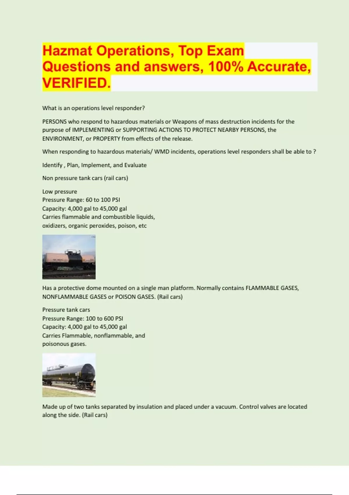 Hazmat Operations, Top Exam Questions and answers, 100% Accurate, VERIFIED. What is an operations level responder? PERSONS who respond to hazardous materials or Weapons of mass destruction incidents for the purpose of IMPLEMENTING or SUPPORTING ACTIONS TO PROTECT NEARBY PERSONS, the ENVIRONMENT, or PROPERTY from effects of the release. When responding to hazardous materials/ WMD incidents, operations level responders shall be able to ? Identify , Plan, Implement, and Evaluate Non pressure tank cars (rail cars) Low pressure Pressure Range: 60 to 100 PSI Capacity: 4,000 gal to 45,000 gal Carries flammable and combustible liquids, oxidizers, organic peroxides, poison, etc Has a protective dome mounted on a single man platform. Normally contains FLAMMABLE GASES, NONFLAMMABLE GASES or POISON GASES. (Rail cars) Pressure tank cars Pressure Range: 100 to 600 PSI Capacity: 4,000 gal to 45,000 gal Carries Flammable, nonflammable, and poisonous gases. Made up of two tanks separated by insulation and placed under a vacuum. Control valves are located along the side. (Rail cars) Cryogenic liquid tank car Pressure: 25 PSI or lower Capacity: Will vary of the material Carries argon, hydrogen, nitrogen oxygen, etc. Bulk containers consists of? (Rail cars) A single metal tank mounted inside a sturdy metal supporting structure. Hazard classes 3,4,5,6,8 (25.4 to 100 PSI) example is whiskey. (Rail cars) IM-101 (IMO Type 1) portable tank Hazard classes 3,6,8 (14.5 to 25.4 PSI) transports whiskey and wine. (Rail cars) IM-102 (IMO Type 2) portable tank Hazard classes 2,3 (100 to 500 PSI) transports liquified petroleum gas (rail cars) Pressure intermodal tank containers Hazard class 2.2 (25 PSI or less) transports helium, nitrogen, and oxygen. (IMO Type 7) (Rail cars) Cryogenic intermodal tanks Hazard class 2.2 (3000 to 5000 PSI) characteristics (permanently mounted within a frame) (Rail cars) Tube modules Hazard classes 5.1, 9 (no greater than 80 PSI) characteristics is V shaped bins and known as "hopper trailer" (unloaded from the bottom and pneumatic- operated by air) (cargo tanks) Dry bulk cargo tanks Hazard class 3 ( greater than 3 PSI but no more than 5 PSI) characteristics large oval ends, spill rail, underbelly outlets. Non pressure liquid cargo tanks (ends with 06) (cargo tanks) Hazard class 3 and 8 (less than 40 PSI/ 170 F) transports mild corrosives/ acids. Characteristics are round cylindrical or horseshoe shape. Overturn protection and single work platform is circular. (Cargo tanks) Low pressure chemical tanks (ends with 07) Hazard class 8 (35 PSI to 50 PSI) transports high density liquids and strong corrosives. (Access housing is often coated with black tar like material) and reinforcement ribs. (Cargo tanks) Corrosive liquid cargo tanks (ending with 12) Hazard class 2 (100 to 500 PSI) transports