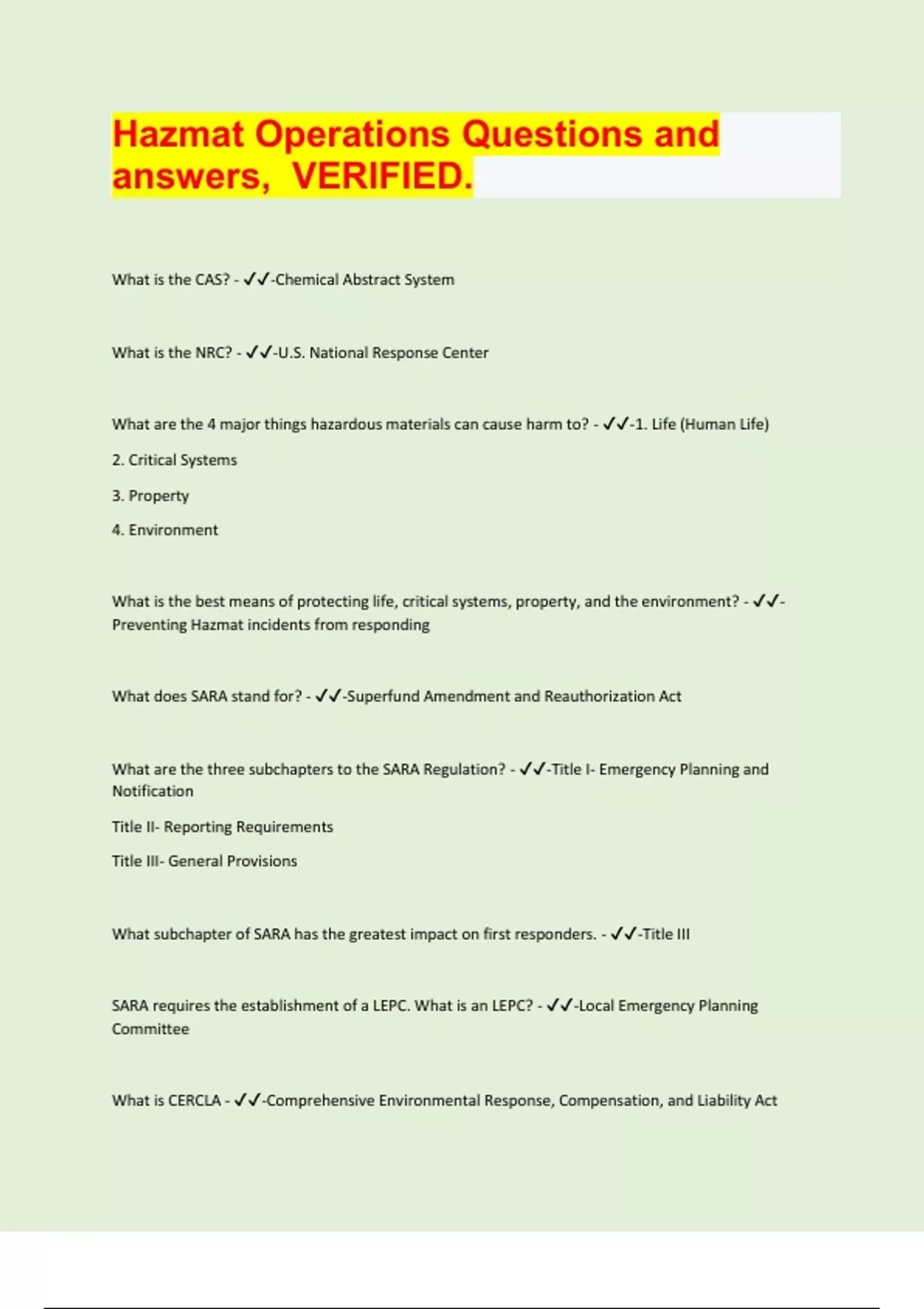 What are the three subchapters to the SARA Regulation? - ✔✔-Title I- Emergency Planning and