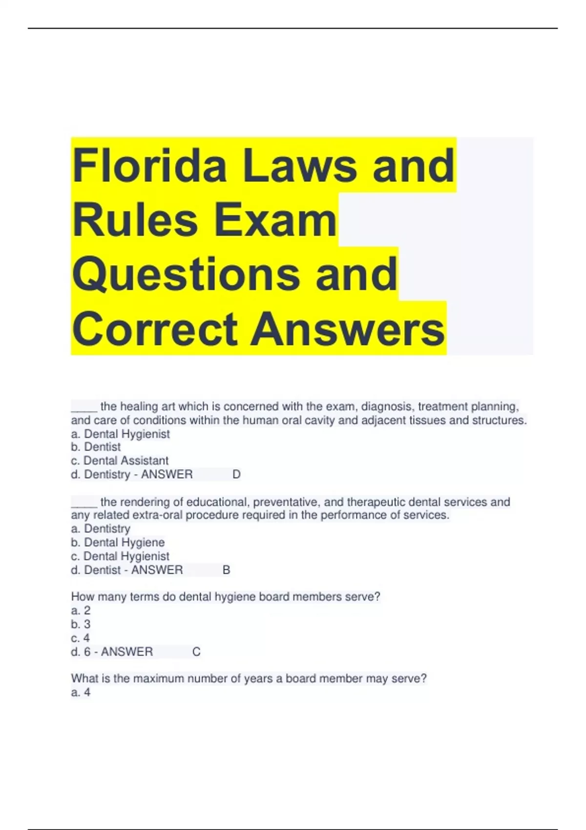 Florida Laws and Rules Exam Questions and Correct Answers ____ the healing art which is concerned with the exam, diagnosis, treatment planning, and care of conditions within the human oral cavity and adjacent tissues and structures. a. Dental Hygienist b. Dentist c. Dental Assistant d. Dentistry - ANSWER D ____ the rendering of educational, preventative, and therapeutic dental services and any related extra-oral procedure required in the performance of services. a. Dentistry b. Dental Hygiene c. Dental Hygienist d. Dentist - ANSWER B How many terms do dental hygiene board members serve? a. 2 b. 3 c. 4 d. 6 - ANSWER C What is the maximum number of years a board member may serve? a. 4 b. 6 c. 8 d. 10 - ANSWER D Who appoints the Board of Dentistry members? a. Past President b. Executive Director BOD c. Governor of FLorida d. President of the CDC - ANSWER C One member of the board must be at least? a. 30 years old b. 40 years old c. 60 years old d. 70 years old - ANSWER C Intraoral treatment tasks which are irreversible and create unaltered changes within the oral cavity or structures. a. Remediable tasks b. Irremediable tasks c. Reversible tasks d. Irreversible tasks - ANSWER B Intraoral treatment tasks which are reversible and do not create unalterable changes within the oral cavity or structures and do not cause an increased risk to the patient. a. Remediable tasks b. Irremediable tasks c. Reversible tasks d. Irreversible tasks - ANSWER A Applying topical with jet spray is what type of task? a. Remediable tasks b. Irremediable tasks c. Reversible tasks d. Irreversible tasks - ANSWER B A dental hygienist who applies bleaching solution, activates light source, monitors and removes in-office bleaching materials is performing a ___ task. a. Irremediable b. Remediable c. Irreversible d. Reversible - ANSWER B