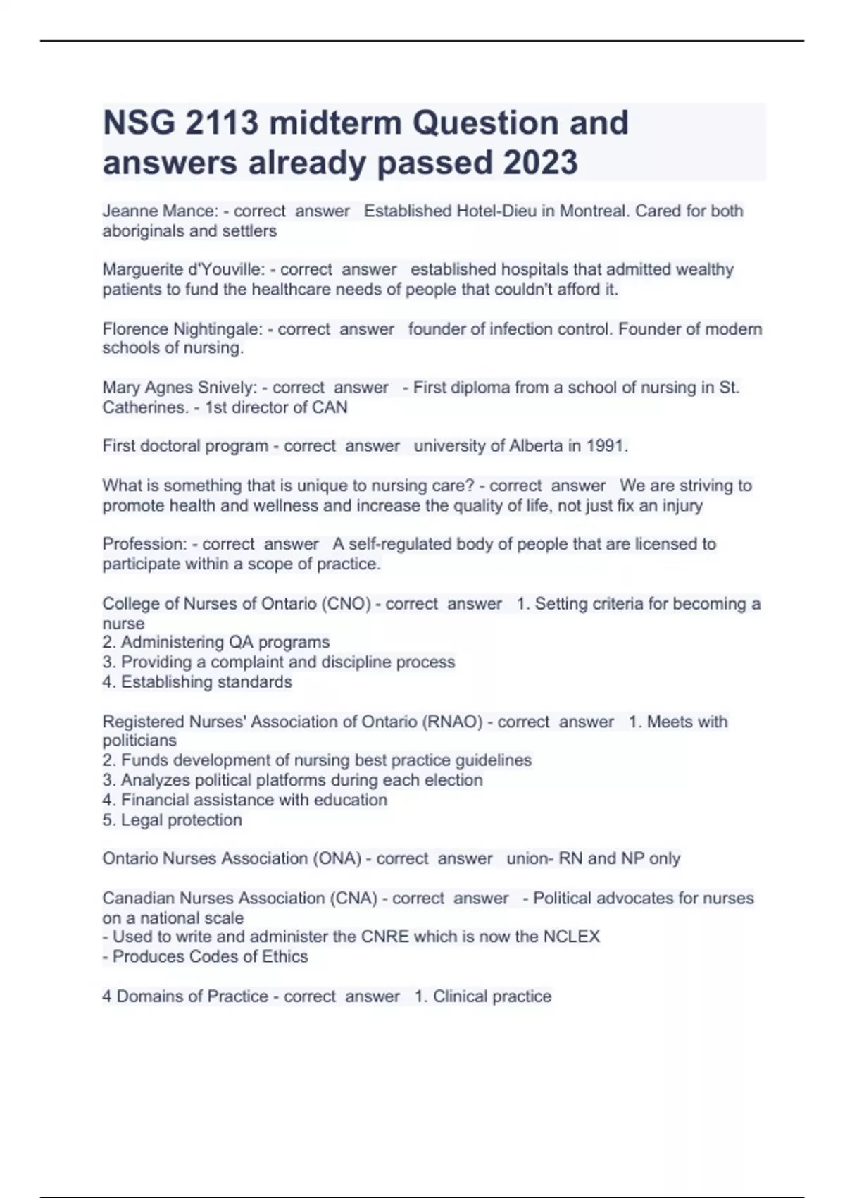 NSG 2113 midterm Question and answers already passed 2023 Jeanne Mance: - correct answer Established Hotel-Dieu in Montreal. Cared for both aboriginals and settlers Marguerite d'Youville: - correct answer established hospitals that admitted wealthy patients to fund the healthcare needs of people that couldn't afford it. Florence Nightingale: - correct answer founder of infection control. Founder of modern schools of nursing. Mary Agnes Snively: - correct answer - First diploma from a school of nursing in St. Catherines. - 1st director of CAN First doctoral program - correct answer university of Alberta in 1991. What is something that is unique to nursing care? - correct answer We are striving to promote health and wellness and increase the quality of life, not just fix an injury Profession: - correct answer A self-regulated body of people that are licensed to participate within a scope of practice. College of Nurses of Ontario (CNO) - correct answer 1. Setting criteria for becoming a nurse 2. Administering QA programs 3. Providing a complaint and discipline process 4. Establishing standards Registered Nurses' Association of Ontario (RNAO) - correct answer 1. Meets with politicians 2. Funds development of nursing best practice guidelines 3. Analyzes political platforms during each election 4. Financial assistance with education 5. Legal protection