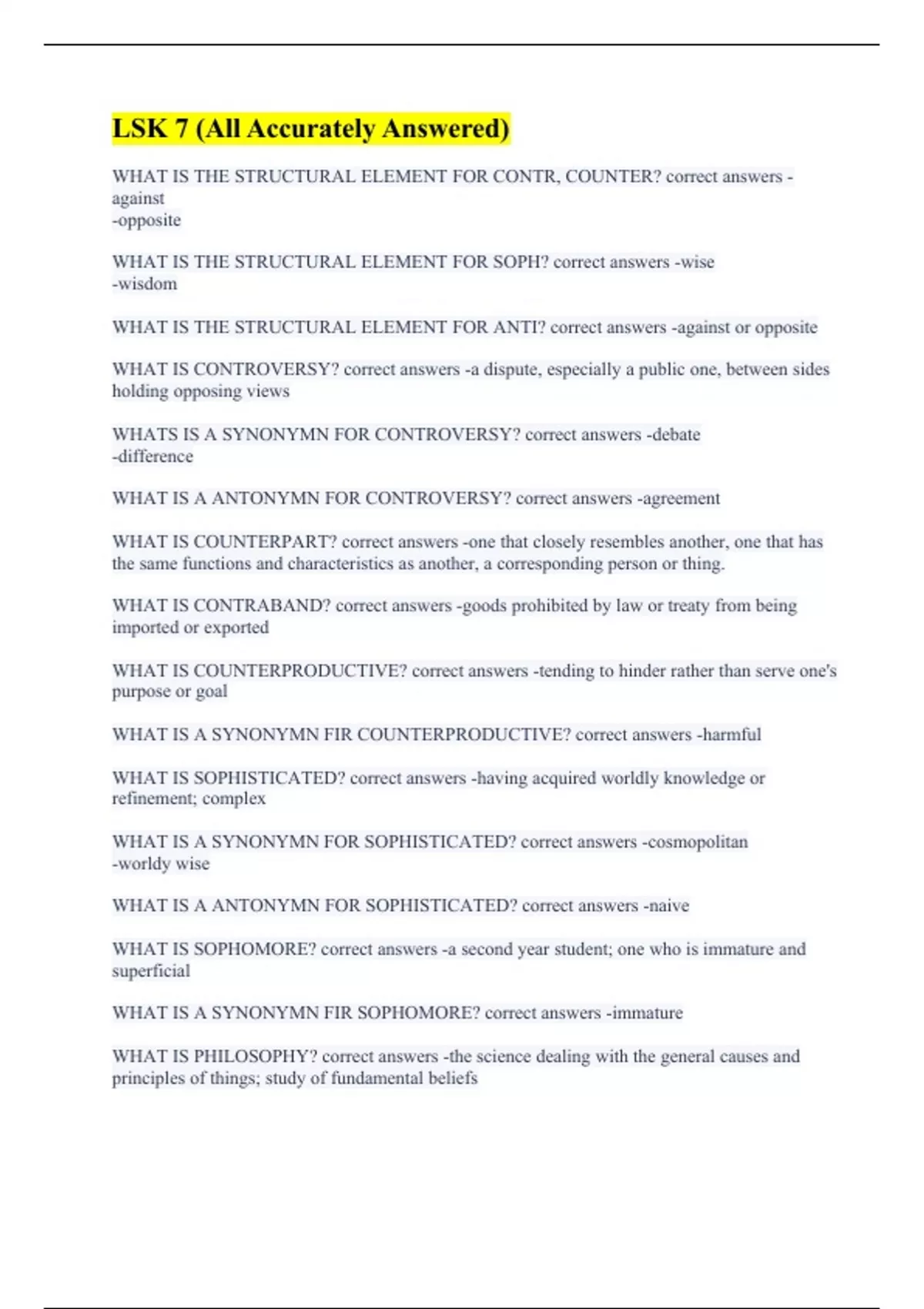 WHAT IS THE STRUCTURAL ELEMENT FOR CONTR, COUNTER? correct answers -against -opposite WHAT IS THE STRUCTURAL ELEMENT FOR SOPH? correct answers -wise -wisdom WHAT IS THE STRUCTURAL ELEMENT FOR ANTI? correct answers -against or opposite WHAT IS CONTROVERSY? correct answers -a dispute, especially a public one, between sides holding opposing views WHATS IS A SYNONYMN FOR CONTROVERSY? correct answers -debate -difference WHAT IS A ANTONYMN FOR CONTROVERSY? correct answers -agreement WHAT IS COUNTERPART? correct answers -one that closely resembles another, one that has the same functions and characteristics as another, a corresponding person or thing. WHAT IS CONTRABAND? correct answers -goods prohibited by law or treaty from being imported or exported WHAT IS COUNTERPRODUCTIVE? correct answers -tending to hinder rather than serve one's purpose or goal WHAT IS A SYNONYMN FIR COUNTERPRODUCTIVE? correct answers -harmful WHAT IS SOPHISTICATED? correct answers -having acquired worldly knowledge or refinement; complex WHAT IS A SYNONYMN FOR SOPHISTICATED? correct answers -cosmopolitan -worldy wise WHAT IS A ANTONYMN FOR SOPHISTICATED? correct answers -naive WHAT IS SOPHOMORE? correct answers -a second year student; one who is immature and superficial WHAT IS A SYNONYMN FIR SOPHOMORE? correct answers -immature WHAT IS PHILOSOPHY? correct answers -the science dealing with the general causes and principles of things; study of fundamental beliefs
