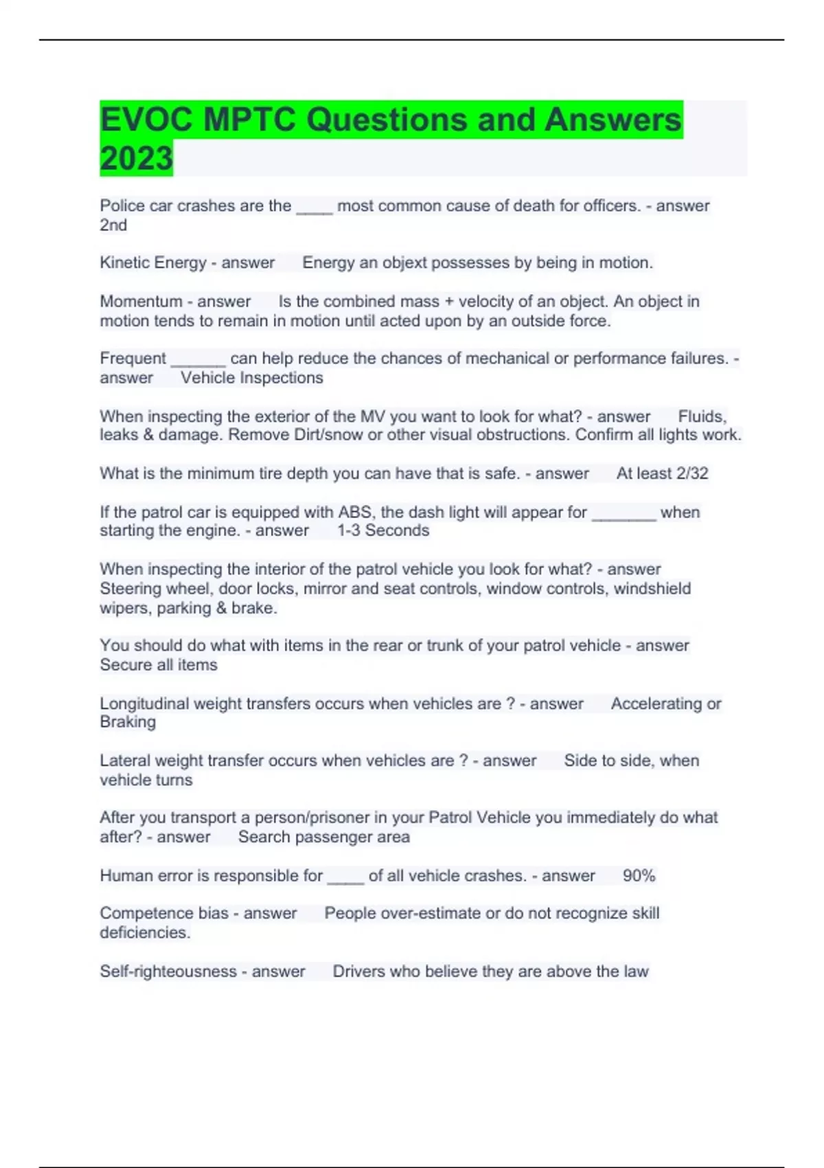 EVOC MPTC Questions and Answers 2023 Police car crashes are the ____ most common cause of death for officers. 2nd Kinetic Energy Energy an objext possesses by being in motion. Momentum Is the combined mass + velocity of an object. An object in motion tends to remain in motion until acted upon by an outside force. Frequent ______ can help reduce the chances of mechanical or performance failures. Vehicle Inspections When inspecting the exterior of the MV you want to look for what? Fluids, leaks & damage. Remove Dirt/snow or other visual obstructions. Confirm all lights work. What is the minimum tire depth you can have that is safe. At least 2/32 If the patrol car is equipped with ABS, the dash light will appear for _______ when starting the engine. 1-3 Seconds When inspecting the interior of the patrol vehicle you look for what? Steering wheel, door locks, mirror and seat controls, window controls, windshield wipers, parking & brake. You should do what with items in the rear or trunk of your patrol vehicle Secure all items Longitudinal weight transfers occurs when vehicles are ? Accelerating or Braking Lateral weight transfer occurs when vehicles are ? Side to side, when vehicle turns After you transport a person/prisoner in your Patrol Vehicle you immediately do what after? Search passenger area Human error is responsible for ____ of all vehicle crashes. 90% Competence bias People over-estimate or do not recognize skill deficiencies. Self-righteousness Drivers who believe they are above the law Less than ____ Hours of sleep your more likely to crash 5 Don't use what, on either pedal to accelerate or brake Left foot Steering wheel hand position 3 & 9 o'clock T.O.P.S stands for? Traffic Occupant Protection Systems T.O.P.S is best described as? Vehicle features and technologies designed to help prevent crashes and keep drivers safe during a crash. ESC stands for? Electronic Stability Control Crash Forces are distributed further when officers wear what 2 things? Seatbelts & Body Armor True or False, do all front and rear passengers have to wear seatbelts, including prisoners? True Airbags fully inflate in _____ at speeds up to 200 Mph 1/2 second Vehicle must strike a fixed object at speeds great than _____ for airbag to deploy 10 mph True or False, When seated upright in the drivers view, part of the vehicle should be visible in either side mirror. False ESC is activated during any of the following? Lateral forces exceed surface friction, speeds exceed the threshold, vehicle begins to slide/skid. Threshold Braking? Used to reduce speed or stop a moving vehicle as quickly as possible with minor steering adjustments. Trail Braking Braking + Turing at the same time. Slowing speed just before turn. Stopping Distance Total number of feet a moving vehicle needs to completely stop True or False, Never Apex until you can see around or out of a turn True Over-steering? Occurs when the vehicle rear tires lose traction and skid to the outside of a turn Under-steering? Curs when the vehicle plows straight through without turning because front tire wheels are sliding. _____ % of all non-emergency law enforcement crashes occur when officers are driving in reverse? 50 Defensive driving Process of minimizing risk + maximize time needed to avoid a crash. What is the most effective way to gain valuable time needed for defensive driving, to minimize risk and avoid a crash? Reducing Speed S.I.P.D.E stands for Scan, Identify, Predict, Decide, Execute Space cushion for a normal day driving is? 2-3 Seconds