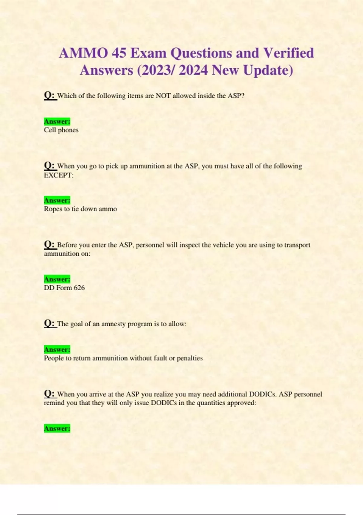 AMMO 45 Exam Questions and Verified Answers (2023/ 2024 New Update) Q: Which of the following items are NOT allowed inside the ASP? Answer: Cell phones Q: When you go to pick up ammunition at the ASP, you must have all of the following EXCEPT: Answer: Ropes to tie down ammo Q: Before you enter the ASP, personnel will inspect the vehicle you are using to transport ammunition on: Answer: DD Form 626 Q: The goal of an amnesty program is to allow: Answer: People to return ammunition without fault or penalties Q: When you arrive at the ASP you realize you may need additional DODICs. ASP personnel remind you that they will only issue DODICs in the quantities approved: Answer: