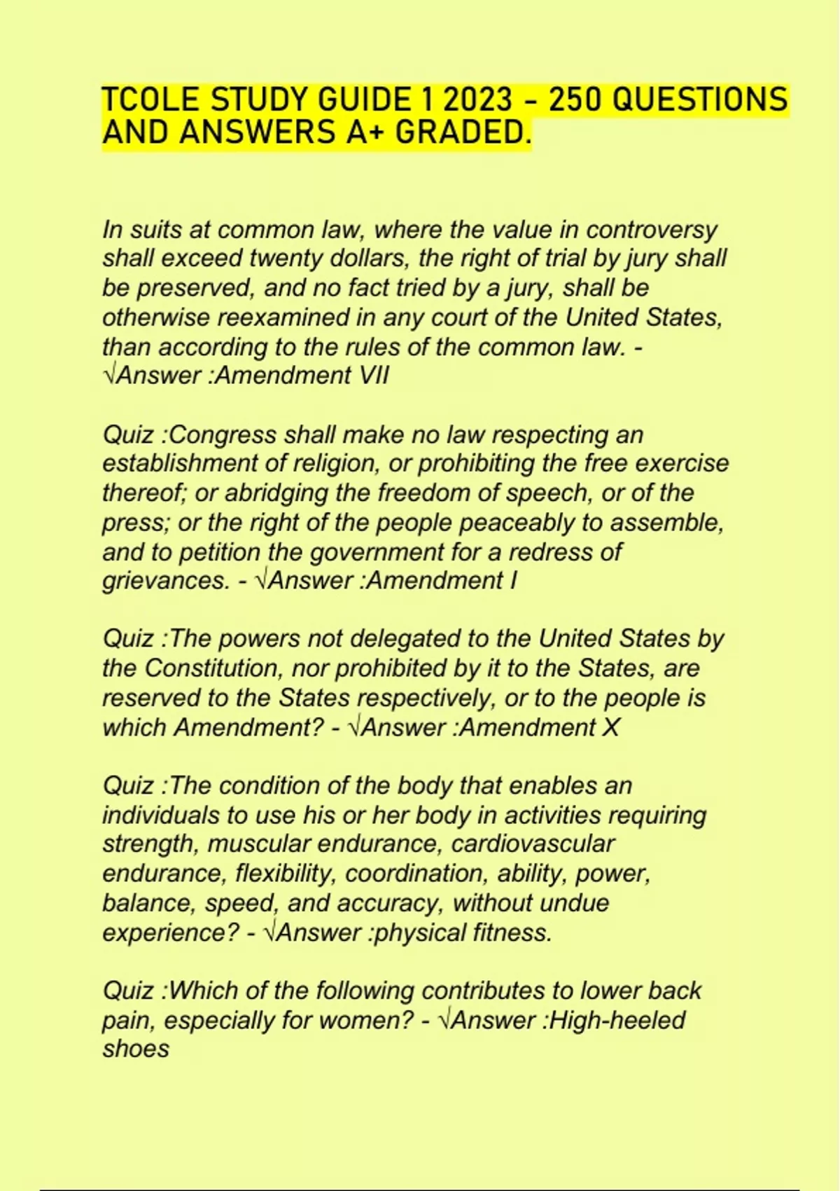 TCOLE STUDY GUIDE QUESTIONS AND ANSWERS A+ GRADED. In suits at common law, where the value in controversy shall exceed twenty dollars, the right of trial by jury shall be preserved, and no fact tried by a jury, shall be otherwise reexamined in any court of the United States, than according to the rules of the common law. - √Answer :Amendment VII Quiz :Congress shall make no law respecting an establishment of religion, or prohibiting the free exercise thereof; or abridging the freedom of speech, or of the press; or the right of the people peaceably to assemble, and to petition the government for a redress of grievances. - √Answer :Amendment I Quiz :The powers not delegated to the United States by the Constitution, nor prohibited by it to the States, are reserved to the States respectively, or to the people is which Amendment? - √Answer :Amendment X Quiz :The condition of the body that enables an individuals to use his or her body in activities requiring strength, muscular endurance, cardiovascular endurance, flexibility, coordination, ability, power, balance, speed, and accuracy, without undue experience? - √Answer :physical fitness. Quiz :Which of the following contributes to lower back pain, especially for women? - √Answer :High-heeled shoes Quiz :A calorie is - √Answer :a measurement of energy. Quiz :A warm-up exercise program should last about - √Answer :15 minutes. Quiz :The health-related components are more important to well-being and quality of life than the _____ components. - √Answer :skill-related Quiz :Which of the following is a physiological effect of prolonged consumption of alcoholic beverages? - √Answer :Cirrhosis of the liver Quiz :The National Commission on Law Observance and Enforcement (Wickersham Commission) reported in 1931 the greatest promise for the future of policing is - √Answer :the college or university Quiz :The annual firearms proficiency requirement for handguns must include a minimum passing percentage of _____% with a minimum firing of _______ rounds, including at least _____rounds of duty ammunition. - √Answer :70%, 50, 5 Quiz :According to TCOLE, the earliest definition of "professionalism" comes from - √Answer :religion Quiz :"_____________" is the state or quality of mind or spirit that enables one to face danger with selfpossession, confidence, and resolution; bravery; valor. - √Answer :Courage Quiz :The Fourteenth Amendment to the Constitution guarantees: - √Answer :due process of law Quiz :The right to be free from unreasonable searches and seizures is found in the - √Answer :Fourth Amendment Quiz :The "Criminal Justice System" structure includes the following three major components: - √Answer :Police, courts, and corrections Quiz :"____________" law which for the purpose of preventing harm to society, (a) declares what conduct is criminal, and (b) prescribes the punishment to be imposed for such conduct. - √Answer :Criminal Quiz :The highest Texas court to hear appeals of criminal cases is - √Answer :Court of Criminal Appeals Quiz :Amendment # _____ states, "The enumeration in the Constitution, of certain rights, should not be construed to deny or disparage others retained by the people." - √Answer :Nine Quiz :The right to be free from unreasonable searches and seizures is found in the - √Answer :None listed Quiz :A case is tried in Justice of the Peace Court and the person is found guilty. What court could the defendant appeal this conviction to? - √Answer :County Quiz :"____________" law is that portion of the law which defines the personal and property rights of individuals; the rights of an individual to seek redress or to prevent a wrong; any action other than criminal proceedings. - √Answer :Civil Quiz :Article 2 of the U.S. Constitution - √Answer :Provides procedure for election of President and Vicepresident of the U.S. Quiz :" _______________" is an order from the court directing the person responsible for holding an individual in jail or prison to bring that person before the court and show what the legal justification is for having the person in custody. - √Answer :Writ of Habeas Corpus Quiz :The requirement that the government must act in accordance with due process of law is contained in which two amendments to the U.S. Constitution? - √Answer :Fifth and Fourteenth Quiz :"____________" is a mental position based on a person's knowledge, feelings, and experiences about someone or something influencing him/her to behave in a certain way in regard to that person or thing. - √Answer :Attitude Quiz :"_____________" is acting on the basis of prejudice. - √Answer :Discrimination Quiz :"___________" refers to shared culture and background. Members of one of these groups generally share language, religion, and other cultural patterns. - √Answer :Ethnicity.