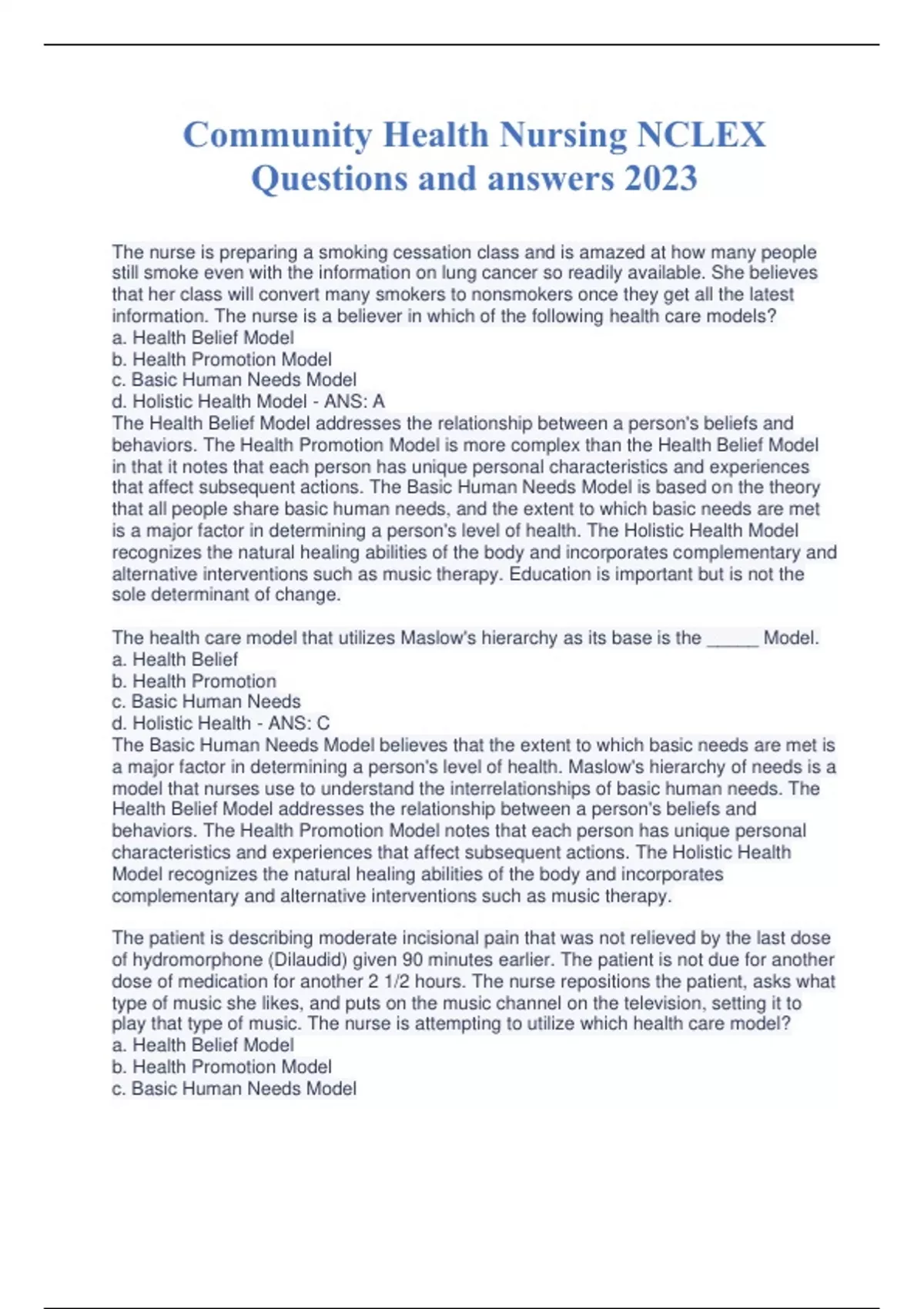 Community Health Nursing NCLEX Questions and answers 2023 The nurse is preparing a smoking cessation class and is amazed at how many people still smoke even with the information on lung cancer so readily available. She believes that her class will convert many smokers to nonsmokers once they get all the latest information. The nurse is a believer in which of the following health care models? a. Health Belief Model b. Health Promotion Model c. Basic Human Needs Model d. Holistic Health Model The health care model that utilizes Maslow's hierarchy as its base is the _____ Model. a. Health Belief b. Health Promotion c. Basic Human Needs d. Holistic Health The patient is describing moderate incisional pain that was not relieved by the last dose of hydromorphone (Dilaudid) given 90 minutes earlier. The patient is not due for another dose of medication for another 2 1/2 hours. The nurse repositions the patient, asks what type of music she likes, and puts on the music channel on the television, setting it to play that type of music. The nurse is attempting to utilize which health care model? a. Health Belief Model b. Health Promotion Model c. Basic Human Needs Model d. Holistic Health Model Many variables influence a patient's health beliefs and practices. Internal and external variables influence how a person thinks and acts. An example of an internal variable would be a. Perception of functioning. b. Family practices. c. Socioeconomic factors. d. Cultural background. The nurse is admitting a patient with uncontrolled diabetes mellitus. It is the fourth time the patient is being admitted in the last 6 months for high blood sugars. During the admission process, the nurse asks the patient about her employment status and displays a nonjudgmental attitude. Why does the nurse do this? a. Noncompliant patients thrive on the disapproval of authority figures. b. External variables have little effect on compliance. c. A person's compliance is affected by economic status. d. Employment status is an internal variable that impacts compliance. The nurse is working on a committee to evaluate the need for increasing the levels of fluoride in the drinking water of the community. In doing so, the nurse is fostering the concept of a. Illness prevention. b. Active health promotion. c. Wellness education. d. Passive health promotion. The nurse is working in a clinic that is designed to provide health education and immunizations. As such, this clinic is designed to provide a. Primary prevention. b. Secondary prevention. c. Tertiary prevention. d. Diagnosis and prompt intervention