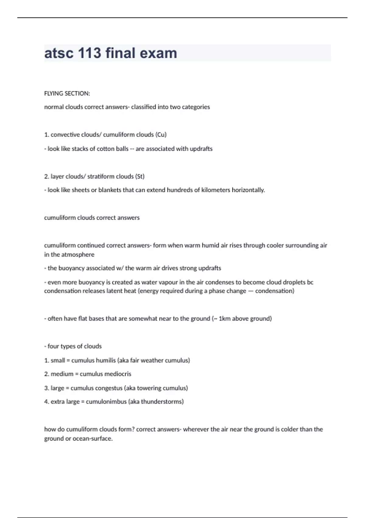 FLYING SECTION: normal clouds correct answers- classified into two categories 1. convective clouds/ cumuliform clouds (Cu) - look like stacks of cotton balls -- are associated with updrafts 2. layer clouds/ stratiform clouds (St) - look like sheets or blankets that can extend hundreds of kilometers horizontally. cumuliform clouds correct answers cumuliform continued correct answers- form when warm humid air rises through cooler surrounding air in the atmosphere - the buoyancy associated w/ the warm air drives strong updrafts - even more buoyancy is created as water vapour in the air condenses to become cloud droplets bc condensation releases latent heat (energy required during a phase change — condensation) - often have flat bases that are somewhat near to the ground (~ 1km above ground) - four types of clouds 1. small = cumulus humilis (aka fair weather cumulus) 2. medium = cumulus mediocris 3. large = cumulus congestus (aka towering cumulus) 4. extra large = cumulonimbus (aka thunderstorms) how do cumuliform clouds form? correct answers- wherever the air near the ground is colder than the ground or ocean-surface.