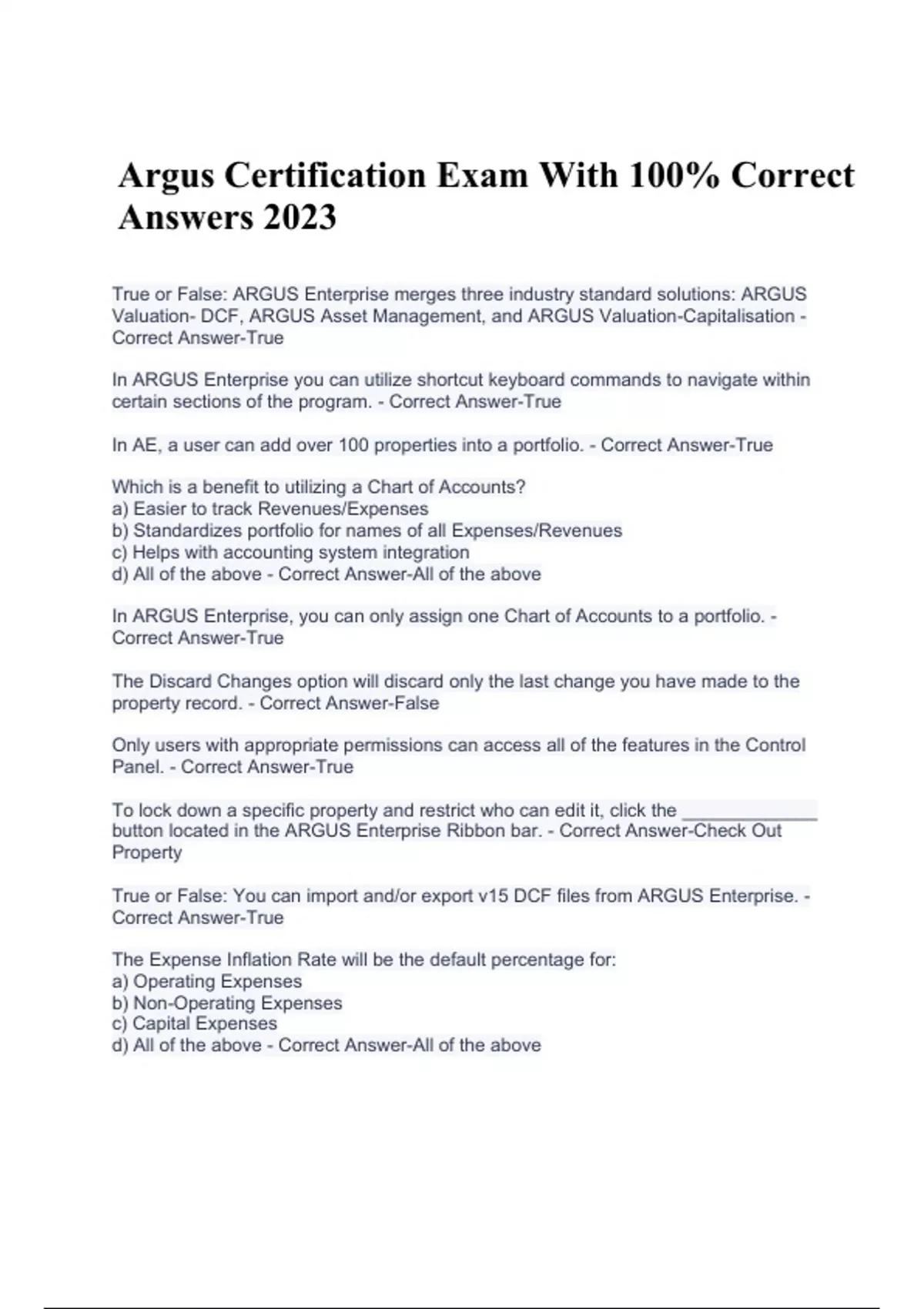 Argus Certification Exam With 100% Correct Answers 2023. True or False: ARGUS Enterprise merges three industry standard solutions: ARGUS Valuation- DCF, ARGUS Asset Management, and ARGUS Valuation-Capitalisation - Correct Answer-True In ARGUS Enterprise you can utilize shortcut keyboard commands to navigate within certain sections of the program. - Correct Answer-True In AE, a user can add over 100 properties into a portfolio. - Correct Answer-True Which is a benefit to utilizing a Chart of Accounts? a) Easier to track Revenues/Expenses b) Standardizes portfolio for names of all Expenses/Revenues c) Helps with accounting system integration d) All of the above - Correct Answer-All of the above In ARGUS Enterprise, you can only assign one Chart of Accounts to a portfolio. - Correct Answer-True The Discard Changes option will discard only the last change you have made to the property record. - Correct Answer-False Only users with appropriate permissions can access all of the features in the Control Panel. - Correct Answer-True To lock down a specific property and restrict who can edit it, click the _____________ button located in the ARGUS Enterprise Ribbon bar. - Correct Answer-Check Out Property True or False: You can import and/or export v15 DCF files from ARGUS Enterprise. - Correct Answer-True The Expense Inflation Rate will be the default percentage for: a) Operating Expenses b) Non-Operating Expenses c) Capital Expenses d) All of the above - Correct Answer-All of the above True or False: Every inflation category must be given a number or it will default to the General Inflation Rate. - Correct Answer-False Assuming a 60% occupancy, calculate the Vending Machine revenue in Year 1 of the analysis (revenue is $13,000 with fixed percentage of 0%). - Correct Answer-$7,800 (.6*13000) Assuming a 0% occupancy, calculate the Vending Machine revenue in Year 1 of the analysis. - Correct Answer-$0 Assuming 100% occupancy, calculate the Vending Machine revenue in Year 1 of the analysis. - Correct Answer-$13,000 What is the Capital Expense amount that will appear on the Cash Flow? - Correct Answer-$63,654??? Free Rent, by default, kick in at the beginning of the _________. - Correct AnswerTenant's Lease Start Date The default recovery structure in ARGUS enterprise is __________. - Correct AnswerNet The Available Date column in the Tenants - Rent Roll, represents the start of the tenant's lease. - Correct Answer-False. The Start Date represents the start of the tenants lease. True or False: By default, Tenant Improvements and Leasing Commissions are paid at the start of the tenant's lease. - Correct Answer-True True or False: The Upon Expiration field within the Market Leasing profile allows users to select a different Market Leasing profile to be used after the first Market Leasing term is over. - Correct Answer-True Contractual Renewal: a) Utilizes the Renew Market Leasing profile terms b) Utilizes the New Market Leasing profile terms c) Inserts a new contract lease into the Rent Roll d) None of the above - Correct Answer-c) Inserts a new contract lease.