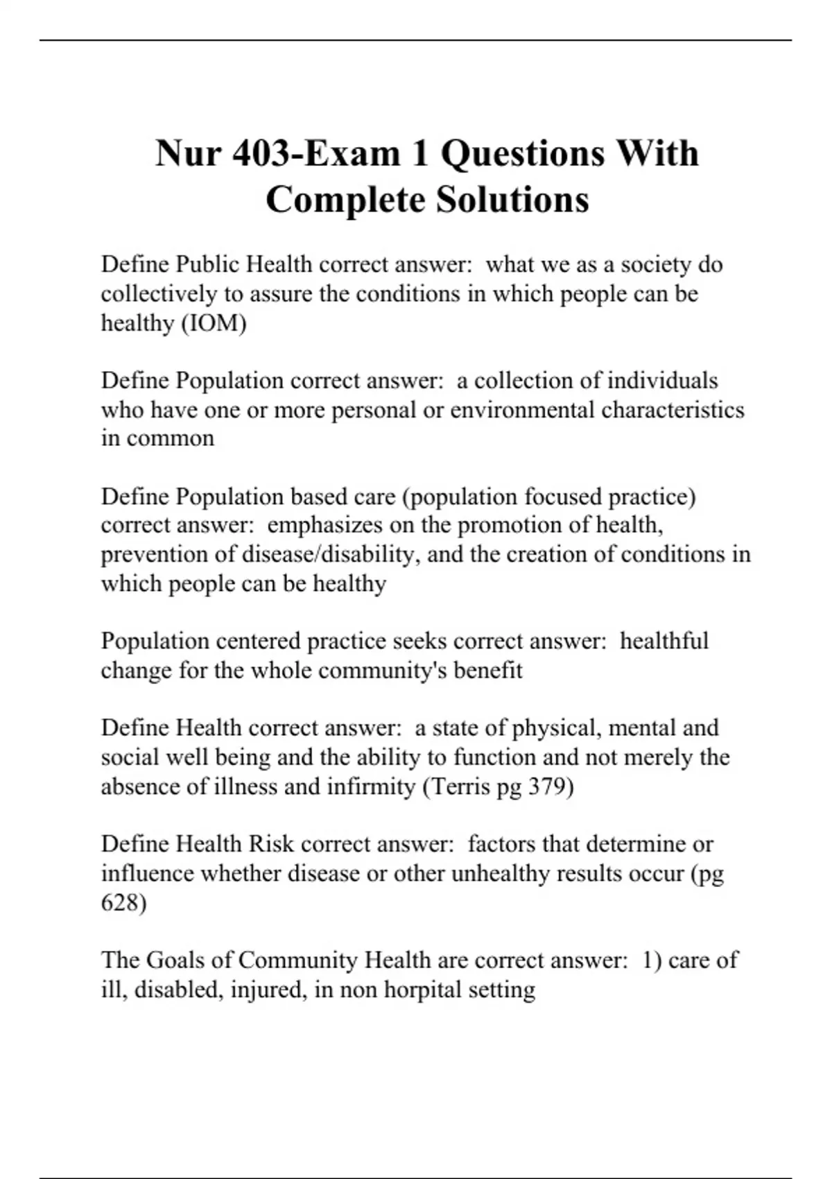 Define Public Health correct answer: what we as a society do collectively to assure the conditions in which people can be healthy (IOM) Define Population correct answer: a collection of individuals who have one or more personal or environmental characteristics in common Define Population based care (population focused practice) correct answer: emphasizes on the promotion of health, prevention of disease/disability, and the creation of conditions in which people can be healthy Population centered practice seeks correct answer: healthful change for the whole community's benefit Define Health correct answer: a state of physical, mental and social well being and the ability to function and not merely the absence of illness and infirmity (Terris pg 379) Define Health Risk correct answer: factors that determine or influence whether disease or other unhealthy results occur (pg 628) The Goals of Community Health are correct answer: 1) care of ill, disabled, injured, in non horpital setting 2) Support well being and development through life cycle
