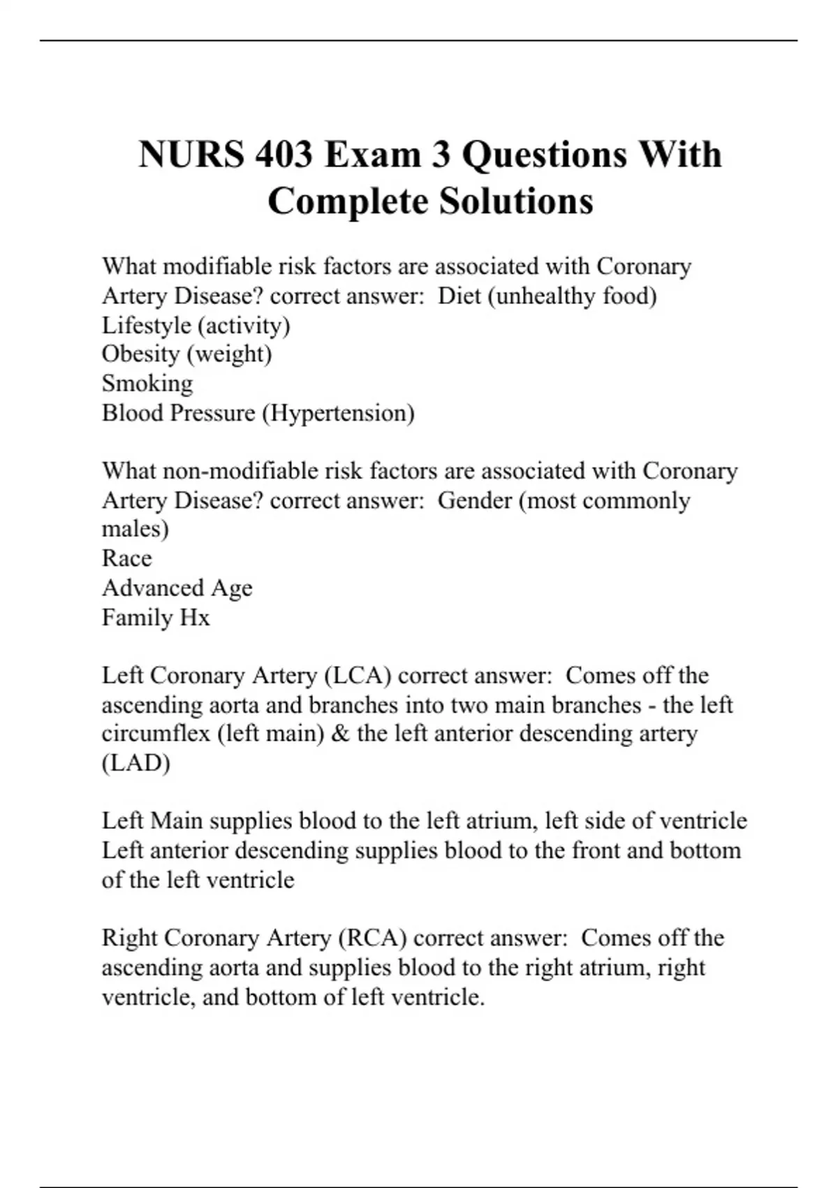 What modifiable risk factors are associated with Coronary Artery Disease? correct answer: Diet (unhealthy food) Lifestyle (activity) Obesity (weight) Smoking Blood Pressure (Hypertension) What non-modifiable risk factors are associated with Coronary Artery Disease? correct answer: Gender (most commonly males) Race Advanced Age Family Hx Left Coronary Artery (LCA) correct answer: Comes off the ascending aorta and branches into two main branches - the left circumflex (left main) & the left anterior descending artery (LAD) Left Main supplies blood to the left atrium, left side of ventricle Left anterior descending supplies blood to the front and bottom of the left ventricle Right Coronary Artery (RCA) correct answer: Comes off the ascending aorta and supplies blood to the right atrium, right ventricle, and bottom of left ventricle. Does collateral circulation happen suddenly? correct answer: No. It gradually develops over time d/t a narrowing or blockage of a vessel.