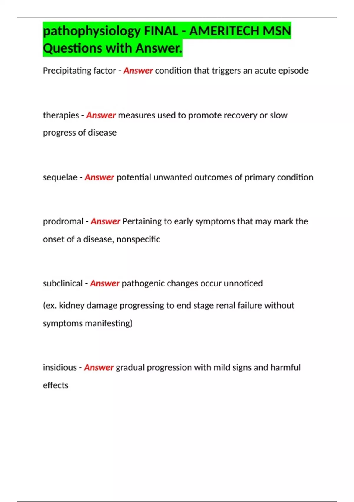 pathophysiology FINAL - AMERITECH MSN Questions with Answer.