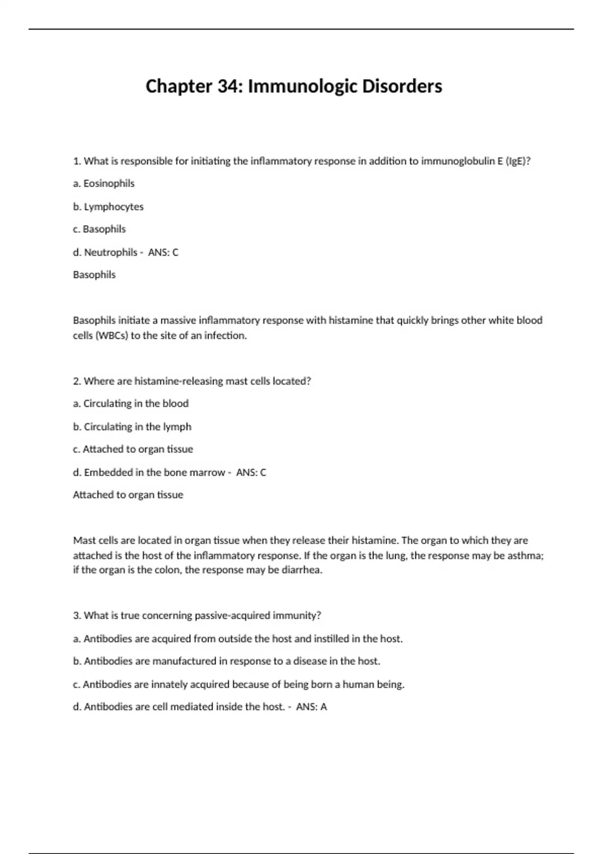 1. What is responsible for initiating the inflammatory response in addition to immunoglobulin E (IgE)? a. Eosinophils b. Lymphocytes c. Basophils d. Neutrophils - ANS: C Basophils Basophils initiate a massive inflammatory response with histamine that quickly brings other white blood cells (WBCs) to the site of an infection. 2. Where are histamine-releasing mast cells located? a. Circulating in the blood b. Circulating in the lymph c. Attached to organ tissue d. Embedded in the bone marrow - ANS: C Attached to organ tissue Mast cells are located in organ tissue when they release their histamine. The organ to which they are attached is the host of the inflammatory response. If the organ is the lung, the response may be asthma; if the organ is the colon, the response may be diarrhea. 3. What is true concerning passive-acquired immunity? a. Antibodies are acquired from outside the host and instilled in the host. b. Antibodies are manufactured in response to a disease in the host. c. Antibodies are innately acquired because of being born a human being. d. Antibodies are cell mediated inside the host. - ANS: A