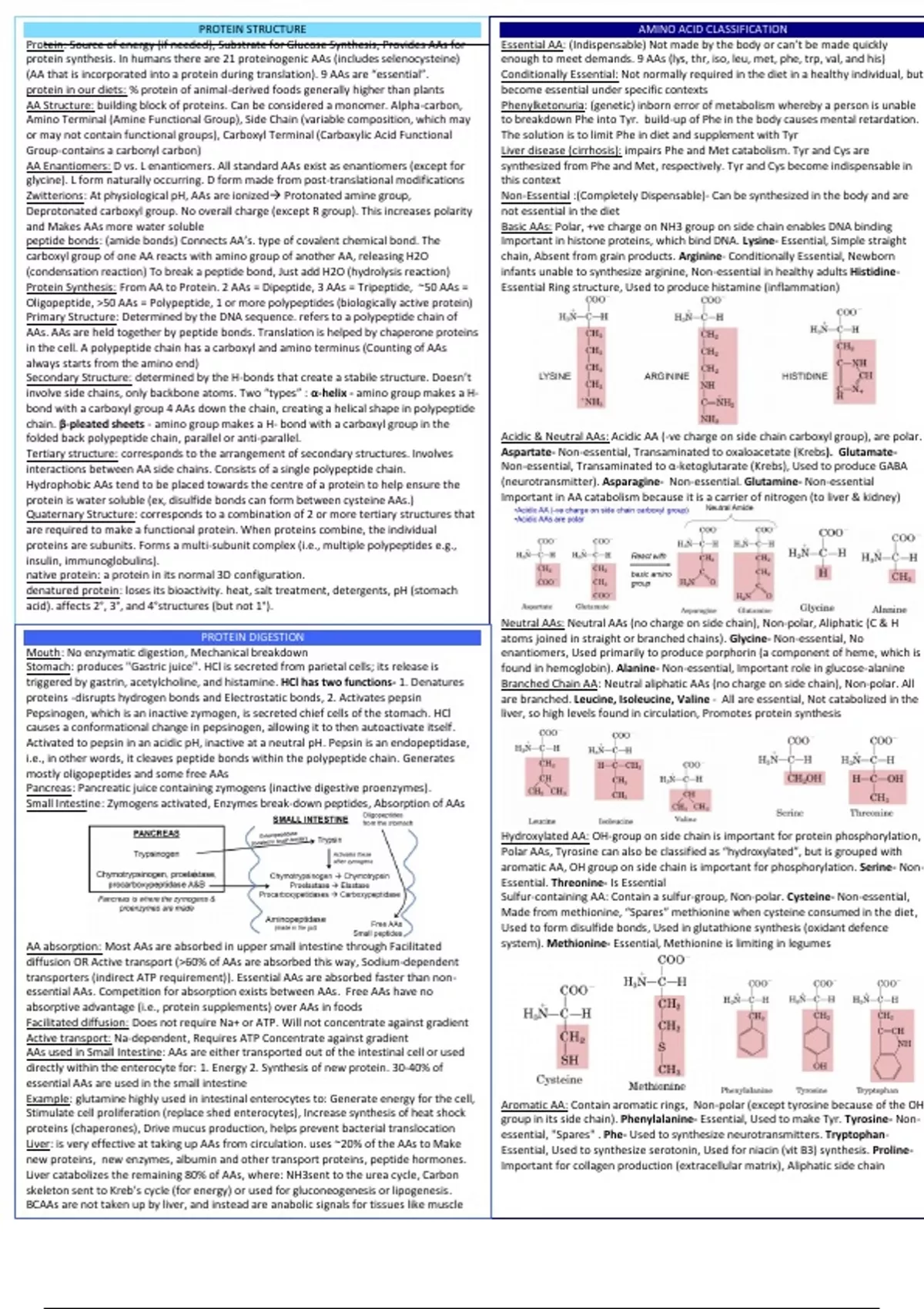 Protein Synthesis: From AA to Protein. 2 AAs = Dipeptide, 3 AAs = Tripeptide, ~50 AAs = Essential Ring structure, Used to produce histamine (inflammation)