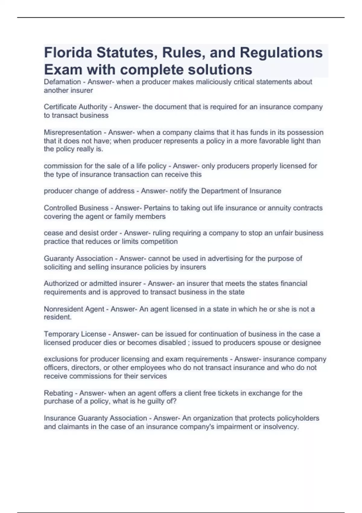 Florida Statutes, Rules, and Regulations Exam with complete solutions