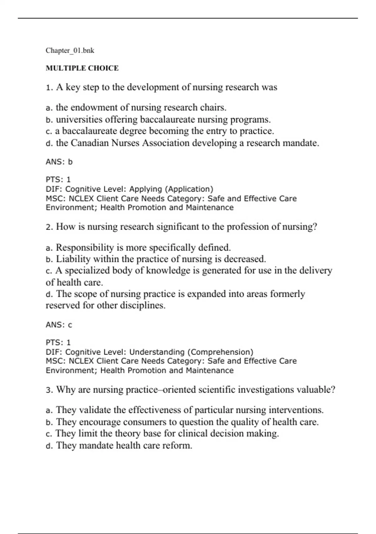 Test Bank for LoBiondo-Wood and Haber's Nursing Research in Canada, 5th Edition 5e by Mina Singh, Lorraine Thirsk. Full Chapters test bank are included - Chap 1 to 21 (Complete Chapters) Part 1: Research Overview Research Vignette: Nursing research to improve immunization in Canada Chapter 1 The Role of Research in Nursing Chapter 2 Theoretical Frameworks Chapter 3 Critical Appraisal Strategies: Reading Research Chapter 4 Developing Research Questions, Hypotheses, and Clinical Questions Chapter 5 Finding and Appraising the Literature Chapter 6 Legal and Ethical Issues Part 2: Indigenous Peoples: Research, Knowledges, and Ways of Knowing Research Vignette: An Interview with Dr. Evelyn Voyageur Chapter 7 Indigenous Peoples: Research, Knowledges, and Ways of Knowing Part 3: Qualitative Research Research Vignette: Public Health Nursing and the Social Construction of Mothering Chapter 8 Introduction to Qualitative Research Chapter 9 Qualitative Approaches to Research Part 4: Quantitative Research Research Vignette: Why I Focus on Violence Against Women and Girls (VAWG) Chapter 10 Introduction to Quantitative Research Chapter 11 Experimental and Quasiexperimental Designs Chapter 12 Nonexperimental Designs Part 5: Processes Related to Research Research Vignette: Nursing Workforce Chapter 13 Sampling Chapter 14 Data-Collection Methods Chapter 15 Rigour in Research Chapter 16 Qualitative Data Analysis Chapter 17 Quantitative Data Analysis Chapter 18 Presenting the Findings Part 6: Critiquing Research Research Vignette: Rural and Remote Nursing Research Chapter 19 Critiquing Qualitative Research Chapter 20 Critiquing Quantitative Research Part 7: Application of Research: Evidence-Informed Practice Research Vignette: The influence of NP Program students in my current research portfolio: Exploring medical cannabis and applying it to clinical practice Chapter 21 Developing an Evidence-Informed Practice