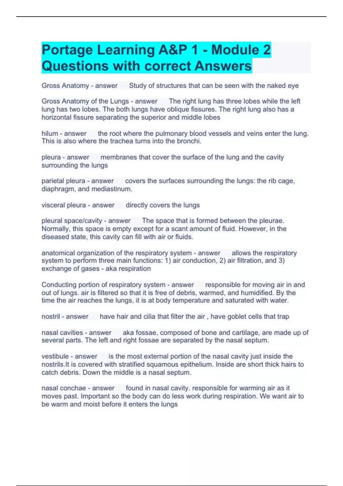 Portage Learning A&P 1 - Module 2 Questions with correct Answers Gross Anatomy Study of structures that can be seen with the naked eye Gross Anatomy of the Lungs The right lung has three lobes while the left lung has two lobes. The both lungs have oblique fissures. The right lung also has a horizontal fissure separating the superior and middle lobes hilum the root where the pulmonary blood vessels and veins enter the lung. This is also where the trachea turns into the bronchi. pleura membranes that cover the surface of the lung and the cavity surrounding the lungs parietal pleura covers the surfaces surrounding the lungs: the rib cage, diaphragm, and mediastinum. visceral pleura directly covers the lungs pleural space/cavity The space that is formed between the pleurae. Normally, this space is empty except for a scant amount of fluid. However, in the diseased state, this cavity can fill with air or fluids. anatomical organization of the respiratory system allows the respiratory system to perform three main functions: 1) air conduction, 2) air filtration, and 3) exchange of gases - aka respiration Conducting portion of respiratory system responsible for moving air in and out of lungs. air is filtered so that it is free of debris, warmed, and humidified. By the time the air reaches the lungs, it is at body temperature and saturated with water. nostril have hair and cilia that filter the air , have goblet cells that trap nasal cavities aka fossae, composed of bone and cartilage, are made up of several parts. The left and right fossae are separated by the nasal septum. vestibule is the most external portion of the nasal cavity just inside the nostrils.It is covered with stratified squamous epithelium. Inside are short thick hairs to catch debris. Down the middle is a nasal septum. nasal conchae found in nasal cavity. responsible for warming air as it moves past. Important so the body can do less work during respiration. We want air to be warm and moist before it enters the lungs Pharynx Throat; the membrane-lined cavity behind the nose and mouth, connecting them to the esophagus. Has 3 parts: nasopharynx, oropharynx, laryngopharynx nasopharynx connection area between the nasal cavity and pharynx, generally above the soft palate- has this name bc connects to nasal cavity oropharynx caudal to the mouth and anterior to the epiglottis. Has this name bc located behind oral cavity. laryngopharynx area where the pharynx, larynx and esophagus meet. Stratified squamous epithelium protects these tissues from frictional damage. Esophagus lies posterior to the larynx and trachea. It is a muscular tube connecting the pharynx with the stomach. It is lined with mucosa. It is the tube that is used for food and nutrients. Trachea (windpipe) passageway for air from larynx to the bronchi. It is composed of about 20 C-shaped, cartilaginous rings that do not completely meet on the posterior side of this tube- they help hold open airway. hard palate and soft palate separate oral cavity from nasal cavity hard palate roof of the mouth soft palate closes nasal cavity when we are eating to make sure food and liquid do not enter the nasal cavity. aspiration when food or liquid accidentally enters the trachea. This may happen because bothfood and air cross in this region. Larynx Attached to the trachea. Can physically feel going up and down when you swallow. This tube is permanently held open to receive air. It is made up of single cartilages and paired cartilages. It is the area that includes the Thyroid, Epiglottis, glottis, cricoid cartilage and vocal cords. single cartilages thyroid cartilage, cricoid cartilage, epiglottis paired cartilages arytenoids, corniculates, cuneiforms- are smaller in size to the single cartilages Epiglottis located in the oropharynx behind the oral cavity- this flap directs food and fluid away from the trachea and into the esophagus. It is a cartilage flap that moves like a trap door. glottis an opening into the larynx, or voice box. The vocal cordsor folds are also located in the larynx. vocal folds (true vocal cords) located at the edge of the glottis, embedded in mucous membranes. Flexible and pliable bands of connective tissue vibrate and produce sound when air is expelled past them through the glottis from the larynx. pneumonia Bacterial infection of the lungs Bronchi two short branches located at the lower end of the trachea that carry air into the lungs. The bronchi resemble the trachea in structure, but as the tubes divide and subdivide, their walls become thinner, and rings of cartilage are no longer present. Bronchioles progressively smaller tubular branches of the airways respiratory epithelium lines the entire bronchial tree. This is primarily made of ciliated, pseudostratified, columnar cells. bronchial tree branched airways that lead from the trachea to the microscopic air sacs called alveoli primary bronchi the two passageways that branch off the trachea and lead to the right and left lungs secondary bronchi branches of the primary bronchi that lead to each lobe of the lung; also called lobar bronchi tertiary bronchi branches of the secondary bronchi that divide into bronchioles; also called segmental bronchi terminal bronchioles the smallest air conducting bronchioles. respiratory bronchioles the transitional zone between conduction and respiratory. in the respiratory system concerned with both air conduction and gas exchange. Alveolar ducts, alveolar sacs, and single alveoli extend from the ends of the respiratory bronchioles. Alveoli are primary way that gasses are exchanged. They are wedged between capillaries. Heavily vascularized area bc must have a lot of blood flow to be able to exchange all the gasses we need for our body. The primary function of the cells within the alveoli is to allow efficient exchange of gases between the air and blood. Histology the study of the cellular anatomy of a tissue or organ that can be viewed through a microscope.A cellular view Cilia 