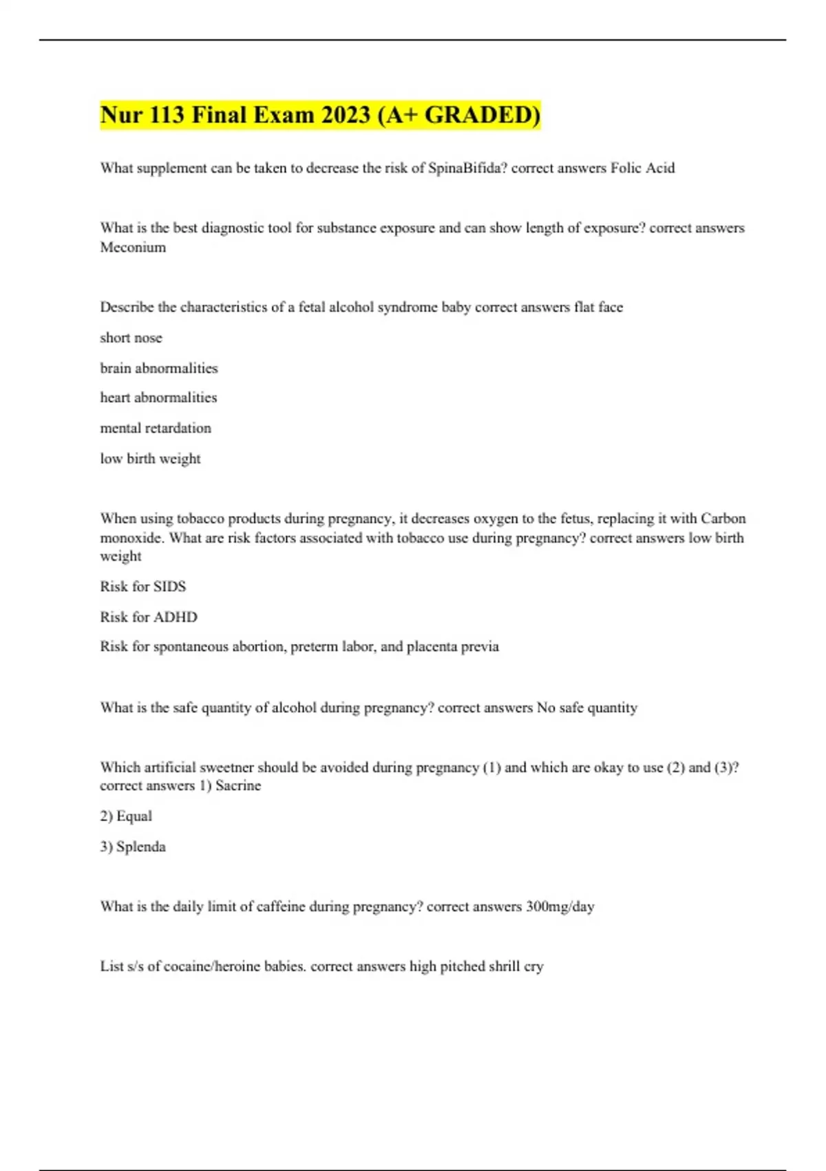 What supplement can be taken to decrease the risk of SpinaBifida? correct answers Folic Acid What is the best diagnostic tool for substance exposure and can show length of exposure? correct answers Meconium Describe the characteristics of a fetal alcohol syndrome baby correct answers flat face short nose brain abnormalities heart abnormalities mental retardation low birth weight When using tobacco products during pregnancy, it decreases oxygen to the fetus, replacing it with Carbon monoxide. What are risk factors associated with tobacco use during pregnancy? correct answers low birth weight Risk for SIDS Risk for ADHD Risk for spontaneous abortion, preterm labor, and placenta previa What is the safe quantity of alcohol during pregnancy? correct answers No safe quantity Which artificial sweetner should be avoided during pregnancy (1) and which are okay to use (2) and (3)? correct answers 1) Sacrine 2) Equal 3) Splenda What is the daily limit of caffeine during pregnancy? correct answers 300mg/day List s/s of cocaine/heroine babies. correct answers high pitched shrill cry