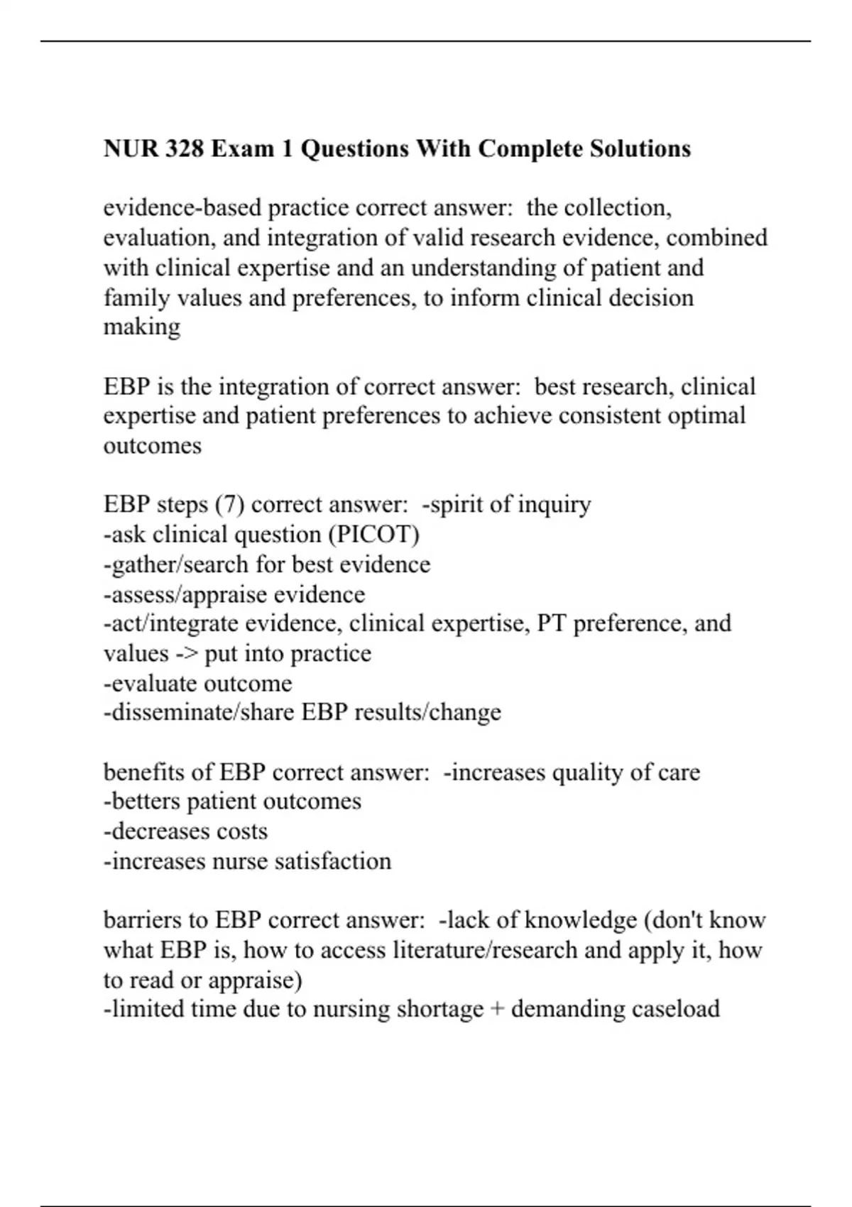 evidence-based practice correct answer: the collection, evaluation, and integration of valid research evidence, combined with clinical expertise and an understanding of patient and family values and preferences, to inform clinical decision making EBP is the integration of correct answer: best research, clinical expertise and patient preferences to achieve consistent optimal outcomes EBP steps (7) correct answer: -spirit of inquiry -ask clinical question (PICOT) -gather/search for best evidence -assess/appraise evidence -act/integrate evidence, clinical expertise, PT preference, and values -> put into practice -evaluate outcome -disseminate/share EBP results/change benefits of EBP correct answer: -increases quality of care -betters patient outcomes -decreases costs -increases nurse satisfaction barriers to EBP correct answer: -lack of knowledge (don't know what EBP is, how to access literature/research and apply it, how to read or appraise) -limited time due to nursing shortage + demanding caseload -lack of resources + support for higher admin -lack of leadership support (no EBP mentors) critical appraisal correct answer: process of carefully and