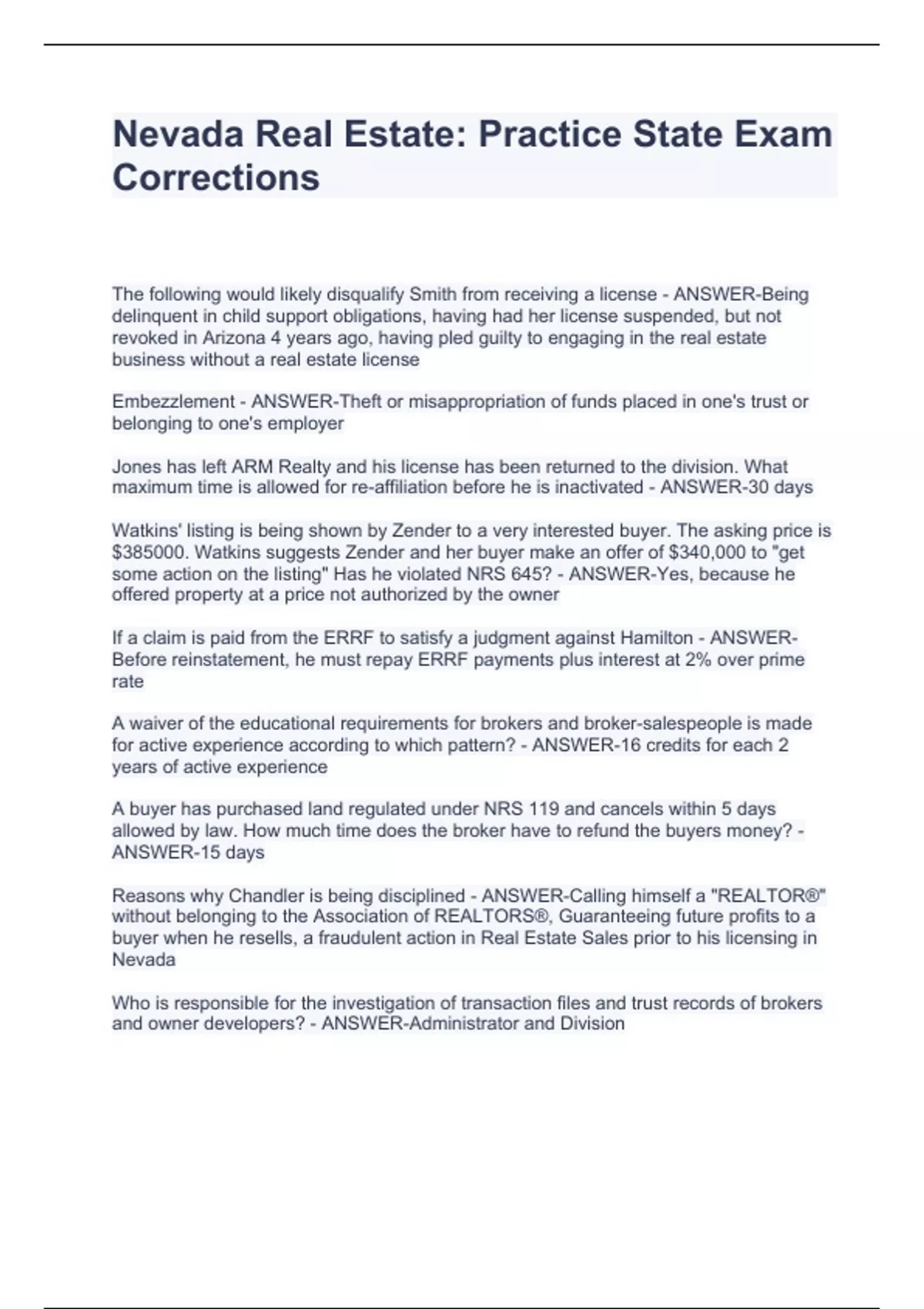 Nevada Real Estate: Practice State Exam Corrections