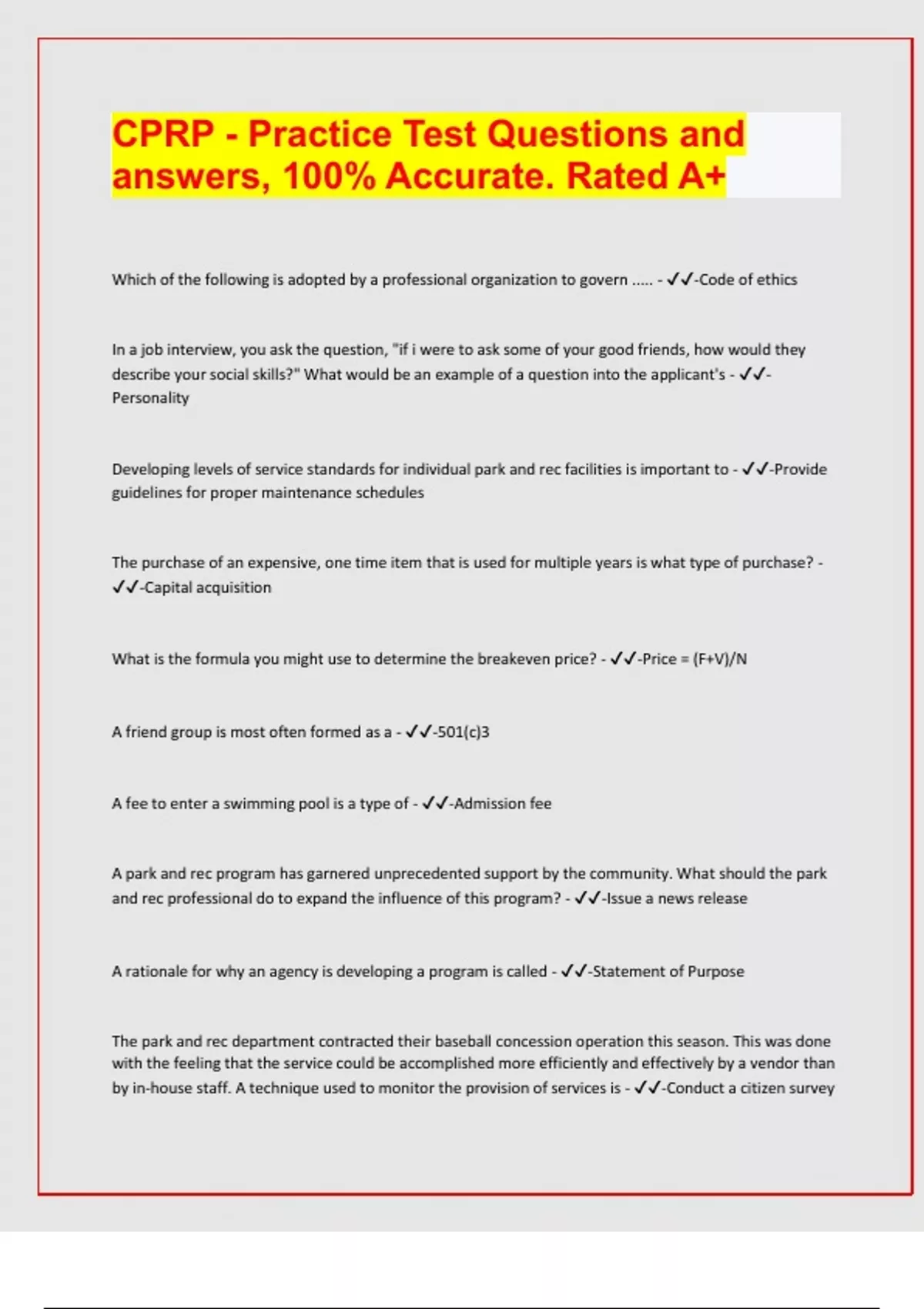CPRP - Practice Test Questions and answers, 100% Accurate. Rated A+ Which of the following is adopted by a professional organization to govern ..... - -Code of ethics In a job interview, you ask the question, "if i were to ask some of your good friends, how would they describe your social skills?" What would be an example of a question into the applicant's - -Personality Developing levels of service standards for individual park and rec facilities is important to - -Provide guidelines for proper maintenance schedules The purchase of an expensive, one time item that is used for multiple years is what type of purchase? - -Capital acquisition What is the formula you might use to determine the breakeven price? - -Price = (F+V)/N A friend group is most often formed as a - -501(c)3 A fee to enter a swimming pool is a type of - -Admission fee A park and rec program has garnered unprecedented support by the community. What should the park and rec professional do to expand the influence of this program? - -Issue a news release A rationale for why an agency is developing a program is called - -Statement of Purpose The park and rec department contracted their baseball concession operation this season. This was done with the feeling that the service could be accomplished more efficiently and effectively by a vendor than by in-house staff. A technique used to monitor the provision of services is - -Conduct a citizen survey This plan focuses on physical resources - -Master Plan The most appropriate tournament format for determining a winner in the least amount of time is a - -Single elimination Which of the following should be the primary consideration in developing park and rec staff work schedules? - -Program Needs A well developed program objective should address - -Who is involved, what will be accomplished, how it will be accomplished, and when it will be accomplished. The most important factor in the retention of volunteer is - -Recognition Which of the following is the best way to communicate work rules and policies? - -Discuss them at in-service training sessions The most important reason for the park and rec supervisor to document the need for disciplinary action is to - -Provide factual details A youth is injured during participation in a program at a recreation facility. Staff should address this by - -Implementing a pre-approved emergency action plan An employee arrives at a facility to open it for public use. Which of the following should be the employee's first action? - -Inspect all areas and equipment for hazards The most important factor in the retention of volunteers is effective - -Recognition A parks maintenance worker takes over a mower from another worker. On the first use by the new worker, the mower is damaged due to lack of oil. Standards require that the oil be checked daily. Which employee should be disciplined for not taking care of the mower? - -Both Before procuring equipment and supplies for programs, the park and rec should - -Conduct an inventory of current assets and their condition The primary goal of community park and rec services for individuals with disabilities is to - -Make life satisfying and meaningful for participants There is a communication gap among an agency's staff. When planning new types of programs and events, and evaluating operations and procedures, the director realizes her executive staff, coordinators and supervisors are not on the same page at all. To correct this problem, it is imperative the director clearly communicates the - -Agencies goals, priorities, and strategic plan A park and rec agency is not required to make all facilities accessible as long as programs offered in inaccessible facilities - -Are available in alternative accessible facilities As posted, a park closes at 10pm. An adult enters the park at midnight and remains undetected. What duty of care is owed to this individual? - -Provide warnings of hazards A rec professional should develop a _____ to determine the total amount of activity funding needed - -Program budget Development of a capital improvement program focuses on which of the following? - -Expected future costs Which of the following factors should determine the content for a department's program evaluation plan? - -Program scope and activities offered Which of the following is generally NOT included in a program evaluation report? - -List of participants Compulsory income is - -Income generated through tax revenue