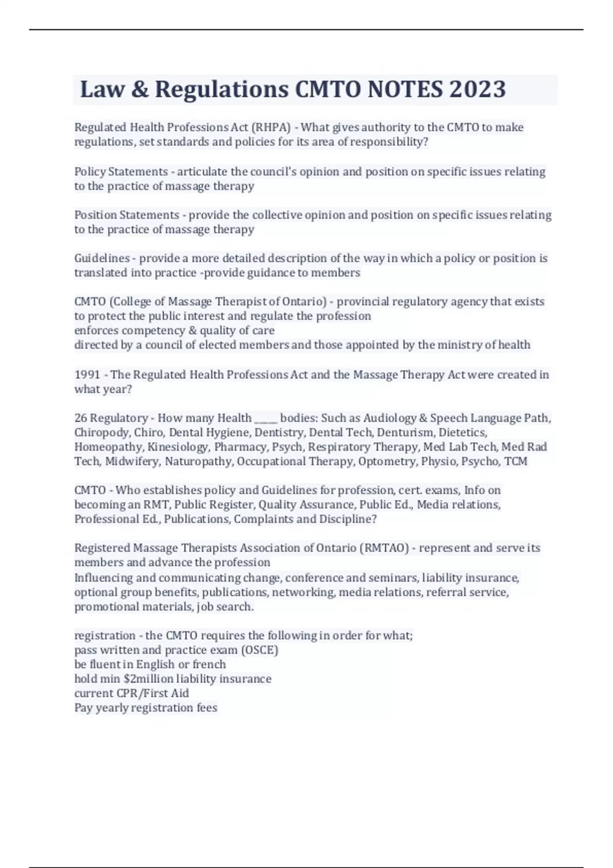 Law & Regulations CMTO NOTES 2023 Regulated Health Professions Act (RHPA) - What gives authority to the CMTO to make regulations, set standards and policies for its area of responsibility? Policy Statements - articulate the council's opinion and position on specific issues relating to the practice of massage therapy Position Statements - provide the collective opinion and position on specific issues relating to the practice of massage therapy Guidelines - provide a more detailed description of the way in which a policy or position is translated into practice -provide guidance to members CMTO (College of Massage Therapist of Ontario) - provincial regulatory agency that exists to protect the public interest and regulate the profession enforces competency & quality of care directed by a council of elected members and those appointed by the ministry of health 1991 - The Regulated Health Professions Act and the Massage Therapy Act were created in what year? 26 Regulatory - How many Health _____ bodies: Such as Audiology & Speech Language Path, Chiropody, Chiro, Dental Hygiene, Dentistry, Dental Tech, Denturism, Dietetics, Homeopathy, Kinesiology, Pharmacy, Psych, Respiratory Therapy, Med Lab Tech, Med Rad Tech, Midwifery, Naturopathy, Occupational Therapy, Optometry, Physio, Psycho, TCM CMTO - Who establishes policy and Guidelines for profession, cert. exams, Info on becoming an RMT, Public Register, Quality Assurance, Public Ed., Media relations, Professional Ed., Publications, Complaints and Discipline? Registered Massage Therapists Association of Ontario (RMTAO) - represent and serve its members and advance the profession Influencing and communicating change, conference and seminars, liability insurance, optional group benefits, publications, networking, media relations, referral service, promotional materials, job search. registration - the CMTO requires the following in order for what; pass written and practice exam (OSCE) be fluent in English or french hold min $2million liability insurance current CPR/First Aid Pay yearly registration fees 500hrs of client care within 3yrs or 3yr massage therapy program or 12month refresher course criminal record check diploma from accredited program Canadian citizen, landed immigrant Certify that you have a principle place of practice`` $600 - Fee to reactivate CMTO membership if lapsed $555 - Yearly CMTO membership fee $160 - Fee to maintain inactive CMTO membership $100 - Late fee for CMTO membership Committees - The following are what to the CMTO; Executive, Registration, Inquiries Complaints and Reports, Discipline, Fitness to Practice, Quality Assurance, Patient Relations College Council - CMTO headed by a board of Directors elected professional members and members of the public appointed by the Minister of Health Administer Regulated Health Professions Act Executive Committee - manage business when council is not in session report actions to council Appeals Committee - meet after each exam after the 30 day limit for appeals relevant to the exam admin process hear all appeals related to the exam process Patient Relations Committee - develop and administer the program develop education required and guidelines for professional interaction between members and clients develop program for promoting public knowledge (sex abuse) ensure regulatory functions are accessible provide council and Reg. Advisory Council with written reports administer funding program to provide therapy/counseling for clients who were sexually abused verify the above program Fitness to Practice Committee - to hear any matter concerning the capacity of a member referred by Inqu./Complaints and Reports Com. render decisions concerning members capacity to practice order revocations, suspensions or impose terms/conditions, limitations inform the therapist of their right to appeal to Divisional Court Inquires Complaints and Reports Committee - investigate all complaints (direct or referred by committees) form boards of inquiry follow up on mandatory reporting (sexual, self, child) refer to discipline committee (sexual, misconduct, incompetence) refer member to another panel for incapacity refer to Fitness to Practice for incapacity require member to appear before a panel to be cautioned invite/order therapist to mediate certain aspects of practice require member to complete - con't ed or remediation if complaint is frivolous/vexatious notify member and complainant the no action will be taken ICRC may dismiss the case Inform client of their right to appeal to HPARB Registration Committee - evaluate foreign trained applicants evaluate other non-standard applications (incl. inactive members) review request from Registrar for imposition of terms/conditions or limitations on a certificate Discipline Committee - hold hearing of all allegations of misconduct refrain from sitting on a panel if there was involvement of investigation make judgements/orders for revocations or suspensions or order impositions of terms/conditions and limitations Quality Assurance Committee - require those who have been assessed and to be found unsatisfactory to participate in con't ed direct the registrar to impose terms/cond or limitations for a specified period to be determined by the committee on the certificate of a reg. member direct the registrar to remove terms/cond or limitations disclose the name of the member and allegations to the Inq/Com and Reports Committee if Q/A is of the opinion that a member may have committed misconduct/incompetence or incapacitated may appoint assessor for the purpose of Q/A program Minister of Health - Administers the Regulated Health Professionals Act (RHPA) Ensures health professions are regulated and co-ordinated in the public interest standards are practice are developed and maintained Advisory Council - established under the name Health Professions Regulatory Advisory Council duty is to advise the Minister decide whether unregulated professions should be regulated or no 