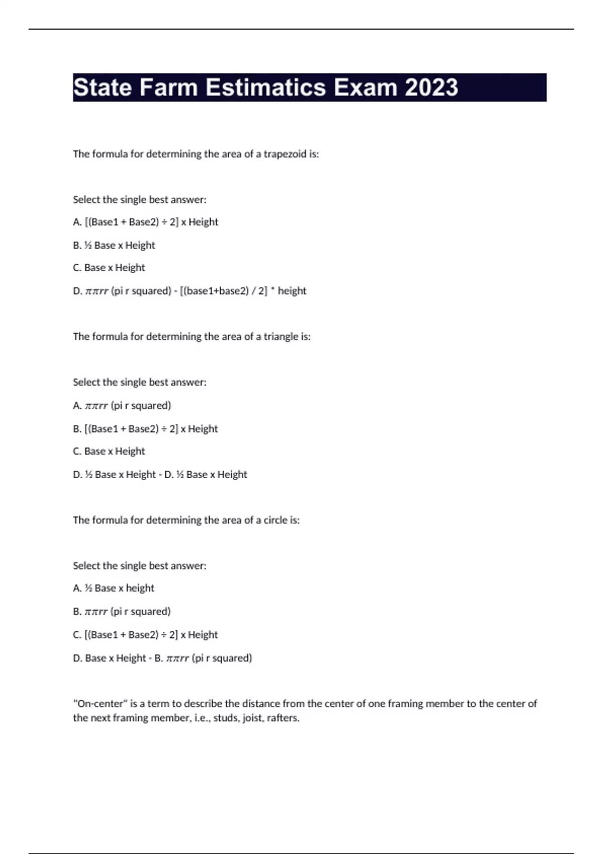 D. Base x Height - B. 𝜋𝜋𝑟𝑟 (pi r squared)