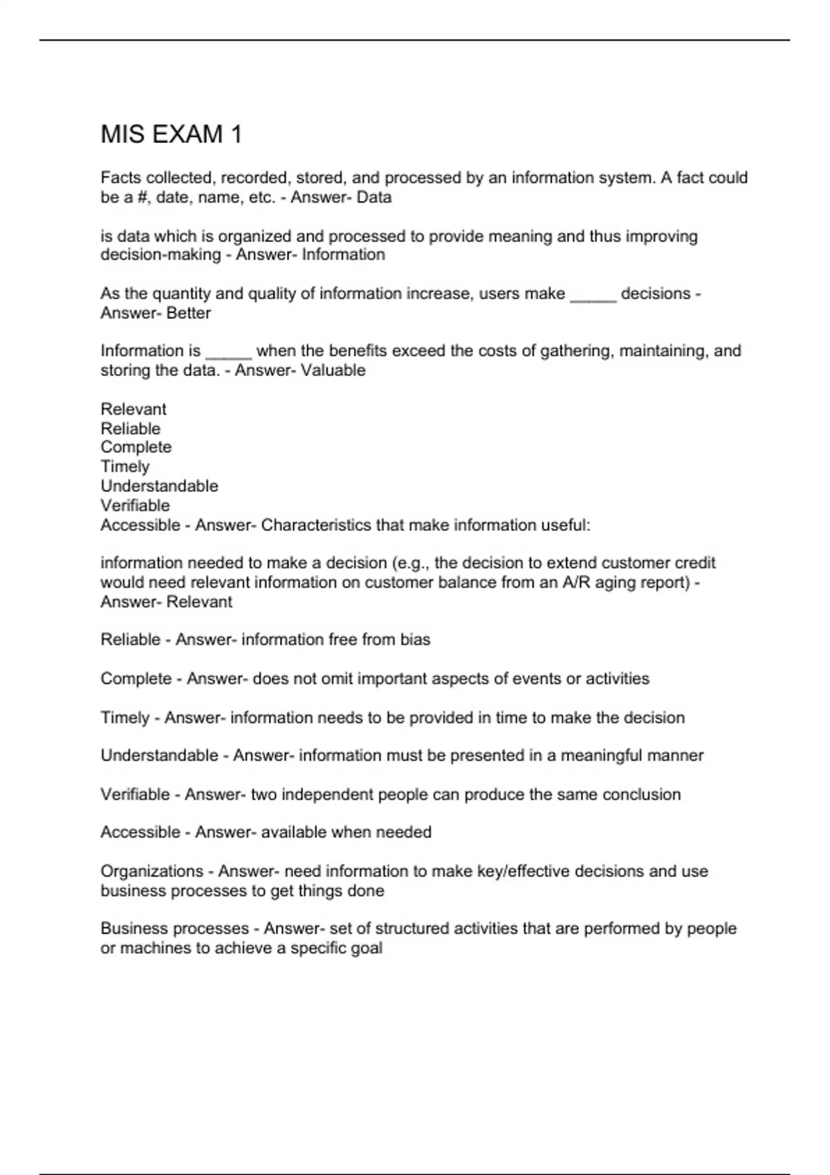 Facts collected, recorded, stored, and processed by an information system. A fact could be a #, date, name, etc. - Answer- Data is data which is organized and processed to provide meaning and thus improving decision-making - Answer- Information As the quantity and quality of information increase, users make _____ decisions - Answer- Better Information is _____ when the benefits exceed the costs of gathering, maintaining, and storing the data. - Answer- Valuable Relevant Reliable Complete Timely Understandable Verifiable Accessible - Answer- Characteristics that make information useful: information needed to make a decision (e.g., the decision to extend customer credit would need relevant information on customer balance from an A/R aging report) - Answer- Relevant Reliable - Answer- information free from bias Complete - Answer- does not omit important aspects of events or activities Timely - Answer- information needs to be provided in time to make the decision Understandable - Answer- information must be presented in a meaningful manner Verifiable - Answer- two independent people can produce the same conclusion Accessible - Answer- available when needed Organizations - Answer- need information to make key/effective decisions and use business processes to get things done Business processes - Answer- set of structured activities that are performed by people or machines to achieve a specific goal